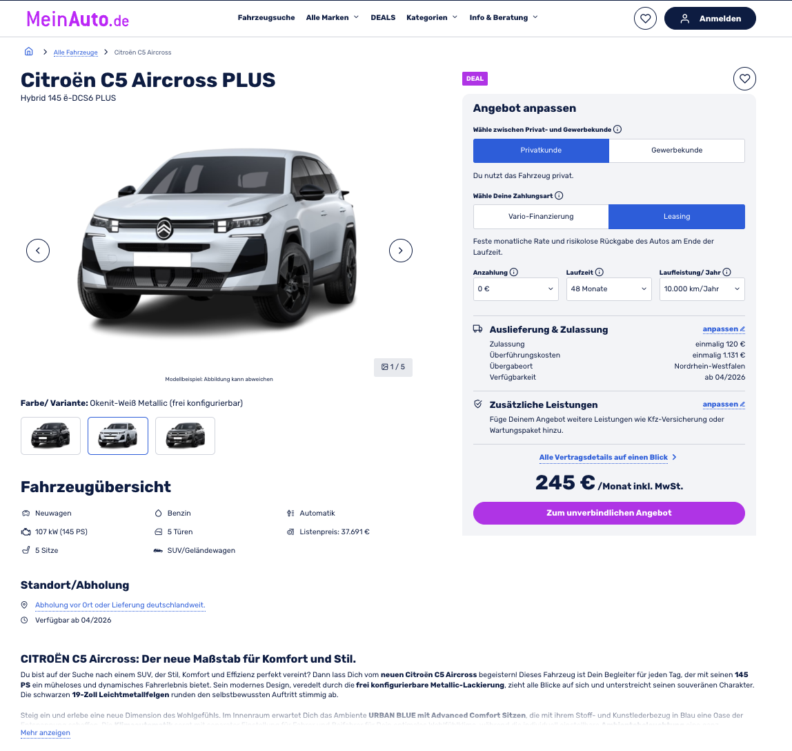 Das Angebot bei MeinAuto ist auf 48 Monate Laufzeit und 10.000 Kilometer pro Jahr ausgelegt, Anpassungen sind möglich. Mit 245 Euro brutto pro Monat liegt der C5 Aircross Hybrid deutlich unter dem Marktvergleich. Beim Marktführer werden aktuell rund 405 Euro brutto aufgerufen. Wer gezielt nach Citroën-C5-Aircross-Leasing, einem komfortablen Hybrid-SUV oder einem entspannten Langstreckenfahrzeug sucht, findet hier ein Angebot, das vor allem eines liefert, Ruhe und Komfort im täglichen Fahren.