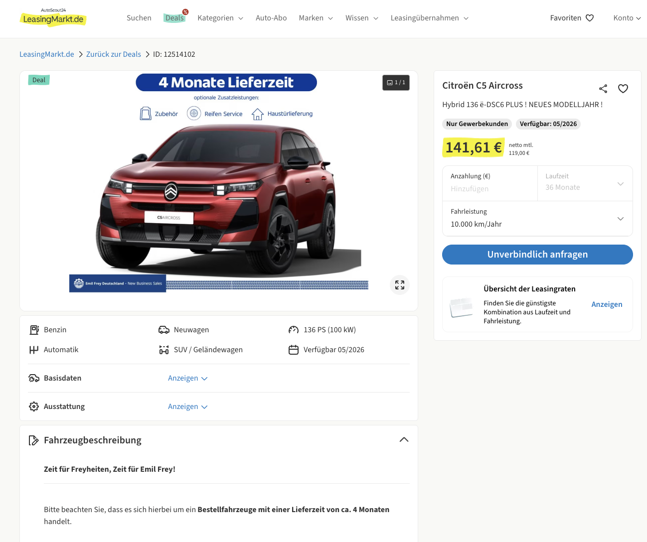 Gelassenheit auf vier Rädern, genau so fühlt sich der C5 Aircross an. Citroën C5 Aircross Hybrid 136 ë-DCS6 PLUS bei LeasingMarkt für 119 Euro im Monat netto ist ein Angebot, das im Geschäftsleasing aktuell auffällig stark kalkuliert ist. Der Leasingfaktor von 0,39 unterstreicht das Ganze zusätzlich. Wichtig für die Planung, hier geht es um ein Bestellfahrzeug, das ihr individuell zusammenstellen könnt, die Lieferzeit liegt bei rund vier Monaten.