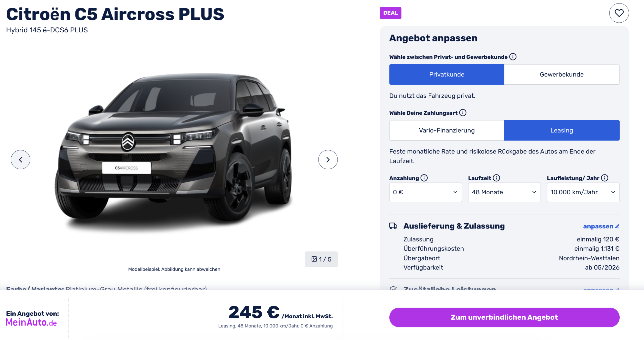Citroën C5 Aircross im Leasing als Bestellfahrzeug für 245 Euro im Monat brutto