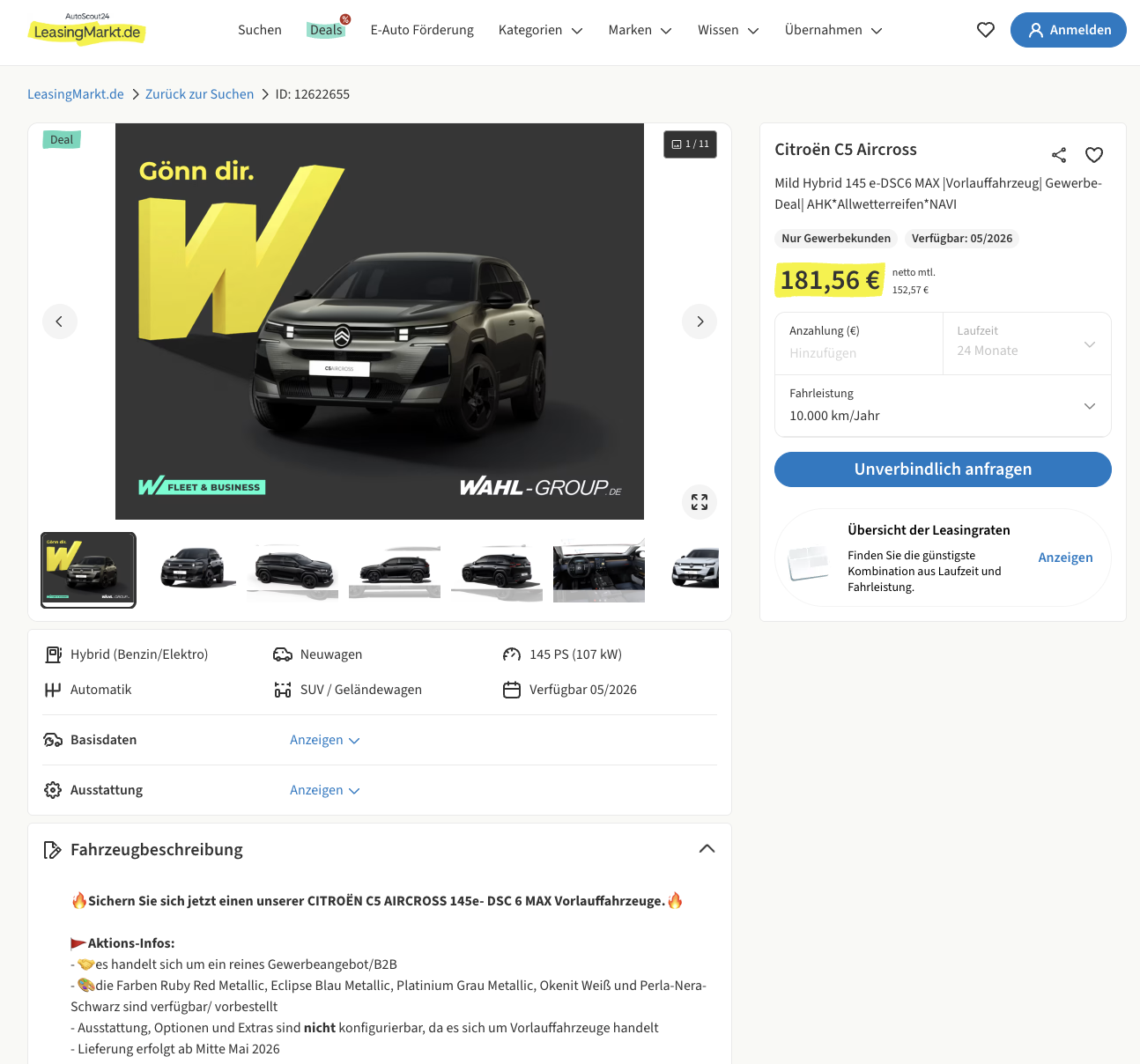 Die Kalkulation basiert auf 24 Monaten Laufzeit und 10.000 Kilometern pro Jahr, Anpassungen sind möglich. Im Vergleich zu vielen anderen Angeboten fällt die Rate niedriger aus. Während vergleichbare Modelle beim Platzhirsch etwa 188 Euro netto monatlich kosten, liegt dieses Angebot deutlich darunter.