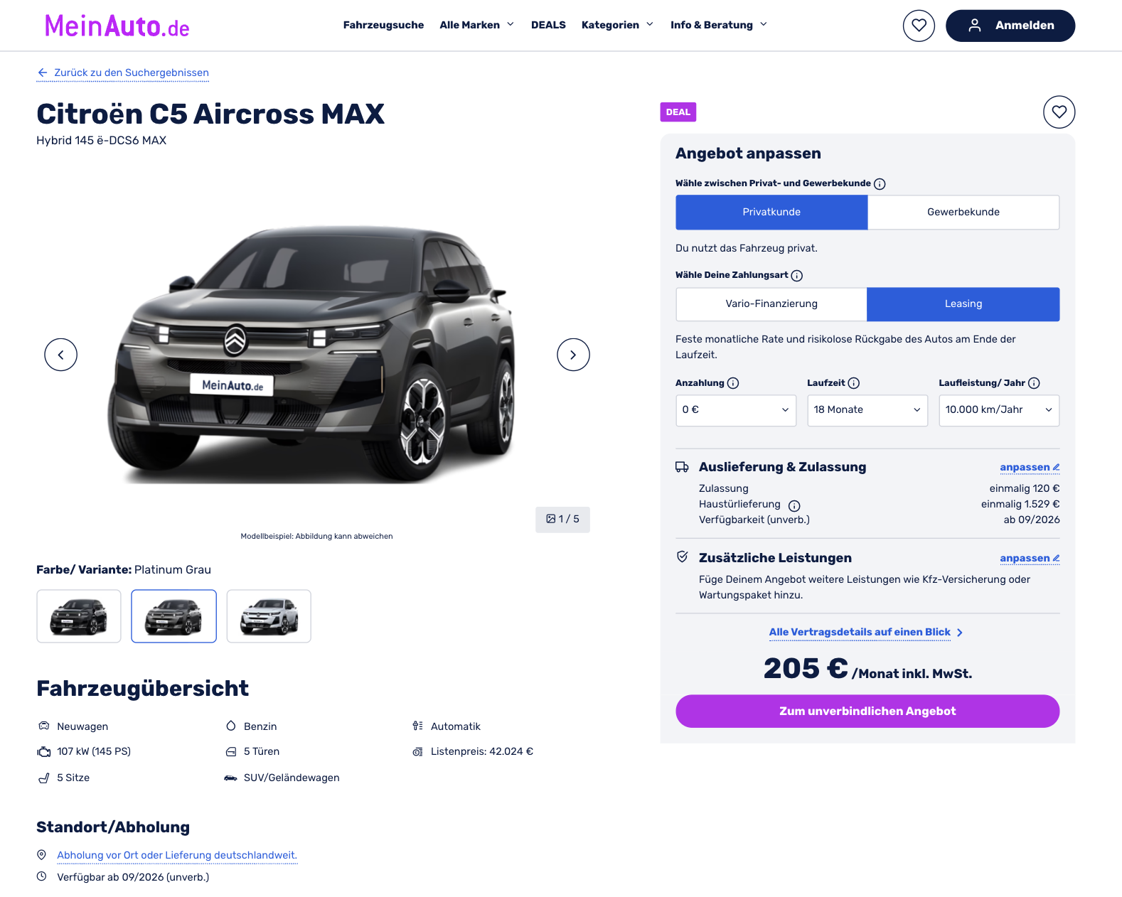 Komfort steht hier klar im Mittelpunkt. Citroën C5 Aircross Hybrid 145 ë-DCS6 MAX bei MeinAuto für 205 Euro brutto im Monat zeigt, wie günstig ein modernes SUV aktuell zu fahren sein kann. Das Angebot basiert auf 18 Monaten Laufzeit und 10.000 Kilometern pro Jahr, der Leasingfaktor liegt bei 0,49. Es handelt sich um ein vorkonfiguriertes Fahrzeug, die Auslieferung ist ab September 2026 geplant. Zur Auswahl stehen Platinum Grau, Perla Nera Schwarz und Okenit Weiß.