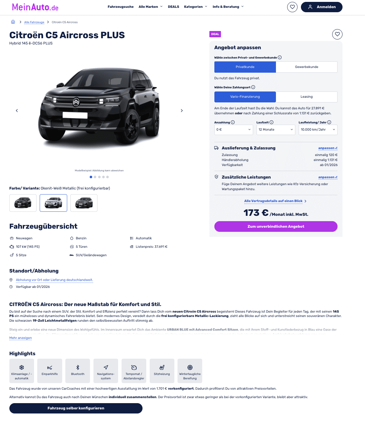 Bei MeinAuto startet der frisch geliftete Citroën C5 Aircross als Hybrid 145 ë-DCS6 Plus zu 173 € brutto/Monat im Vario-Leasing. Das Modell bleibt komplett frei konfigurierbar, Lack, Pakete, Räder, Assistenz. Am Laufzeitende habt ihr die Wahl: übernehmen für 27.891 € oder zurückgeben (bei Schlussrate 1.131 €). Wer lieber klassisch least, findet die Alternative ab 268 € brutto/Monat. Die Auslieferung des Bestellfahrzeugs ist für Januar 2026 terminiert.