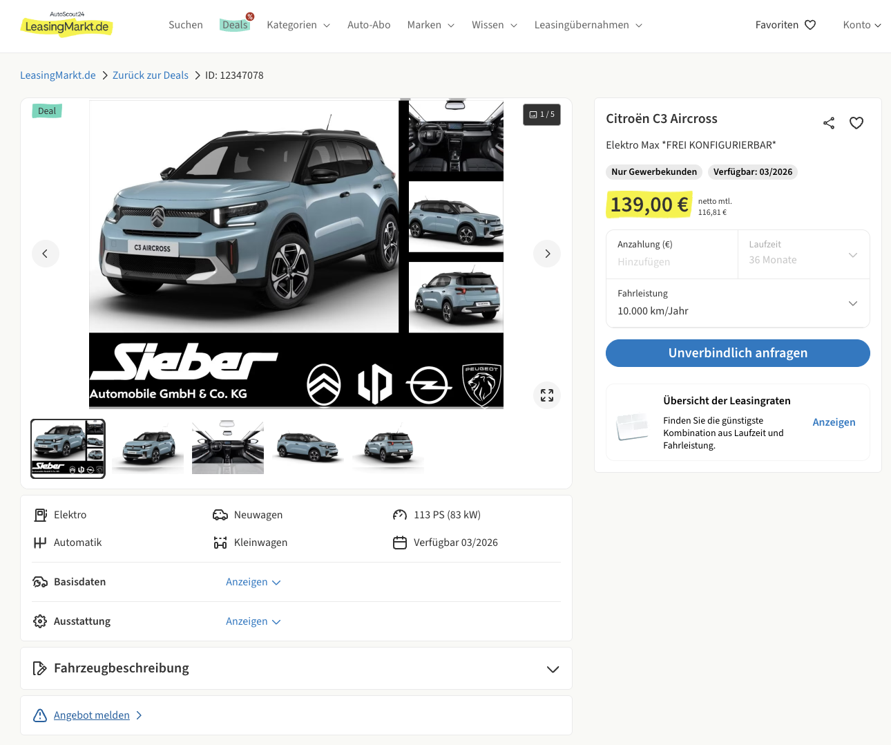 Kalkuliert ist das Angebot mit 36 Monaten und 10.000 Kilometern pro Jahr, Anpassungen sind möglich. Im Vergleich liegt der Platzhirsch aktuell bei 257 Euro netto pro Monat, damit steht dieses Angebot preislich sehr deutlich darunter.