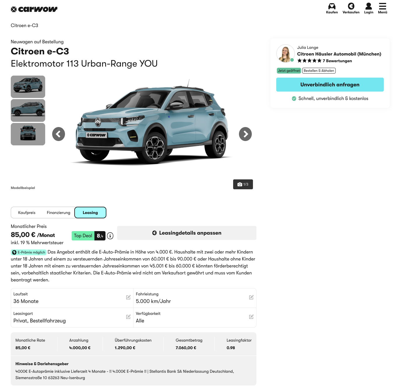 Der Einstieg in die Elektromobilität kann auch unkompliziert funktionieren. Citroën ë-C3 113 Urban-Range YOU bei carwow für 85 Euro brutto im Monat leasen, kalkuliert mit einer Anzahlung von 4.000 Euro, die im Angebot als Umweltprämie angesetzt wird. Angeboten wird ein frei konfigurierbares Bestellfahrzeug mit einer Lieferzeit von rund drei Monaten. Damit richtet sich der Deal klar an alle, die ein einfaches, alltagstaugliches E-Auto suchen und nicht lange auf einen Lagerwagen warten möchten.