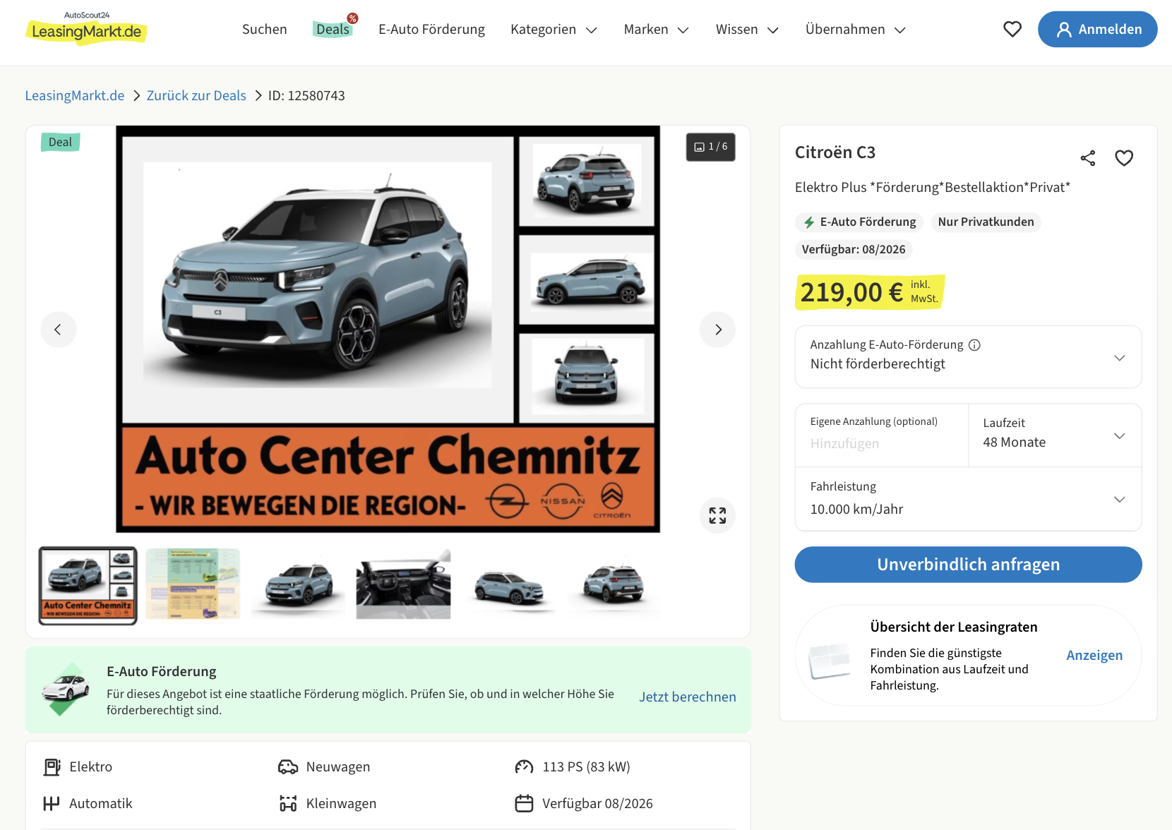 Spannend wird das Angebot vor allem beim Blick auf den Markt. Beim Marktführer kostet der Citroën ë-C3 monatlich 337 Euro brutto, hier stehen dagegen 219 Euro brutto im Angebot. Auf Basis von 48 Monaten Laufzeit und 10.000 Kilometern pro Jahr entsteht so ein Deal, der den elektrischen Einstieg deutlich greifbarer macht.