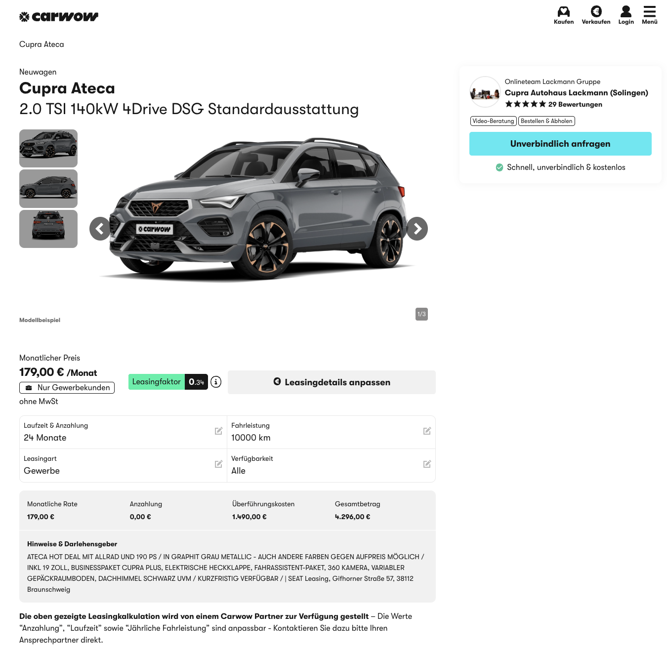 Zum Jahresende noch einen schnellen Business-Deal mit Substanz mitnehmen. Geschäftskunden können aktuell den Cupra Ateca 2.0 TSI 140 kW 4Drive DSG bei carwow für 179 Euro netto im Monat leasen, ein sofort verfügbar Lagerwagen in Graphit Grau Metallic, mit top Ausstattung. Andere Farben sind gegen Aufpreis erhältlich.