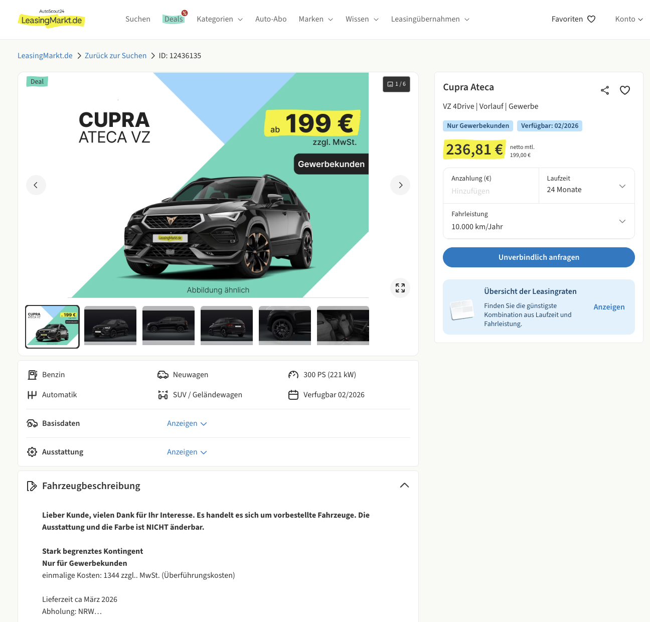 Das Leasing bei LeasingMarkt ist auf 24 Monate und 10.000 Kilometer pro Jahr ausgelegt. Beide Werte lassen sich in der Regel anpassen, falls mehr Strecke oder eine andere Laufzeit gefragt ist. Im Vergleich dazu liegt der Platzhirsch mit rund 520 Euro netto pro Monat für einen Cupra Ateca VZ deutlich höher. Hier steht der VZ für 199 Euro netto, also für weniger als die Hälfte, inklusive fixer, hochwertiger Ausstattung, begrenztem Kontingent und klar geregelter Abwicklung über NRW.