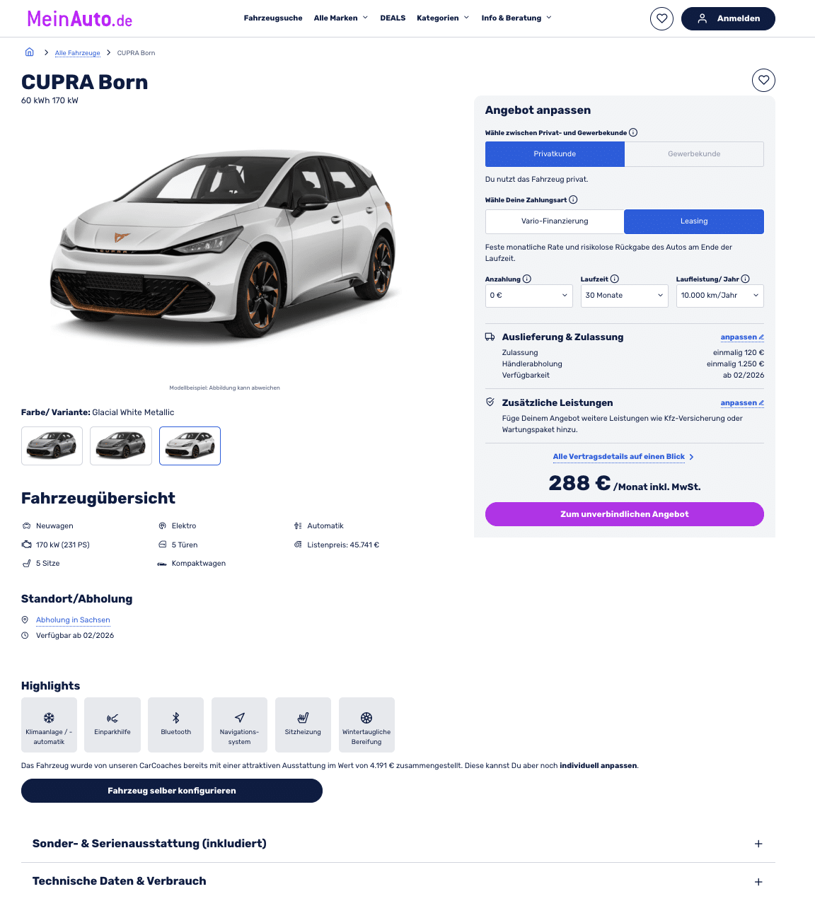 Der Cupra Born ist progressiv, sportlich und kompromisslos modern. Bei MeinAuto gibt es den Cupra Born 60 kWh 170 kW schon für 288 Euro brutto im Monat im Leasing. Frei konfigurierbar, individuell planbar, mit Lieferzeit von nur drei bis vier Monaten. Und das Beste: Ihr spart kräftig, denn beim Marktführer kostet derselbe Stromer stolze 409 Euro. Hier heißt es nicht sparen oder fahren, sondern beides.