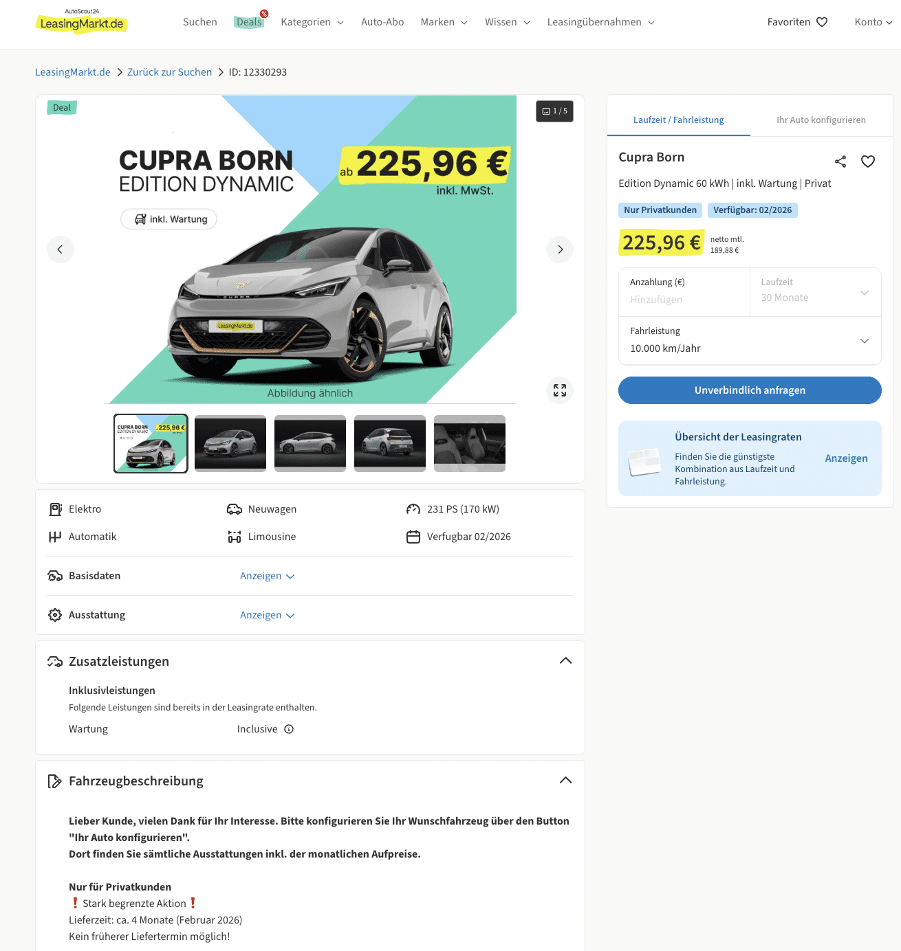 Ein Angebot für alle, die ihr Elektroauto mit Emotion fahren wollen: Der Cupra Born 60 kWh 170 kW Edition Dynamic geht bei LeasingMarkt für 225,96 € brutto im Monat an den Start, Wartungsarbeiten sind dank Service-Paket bereits abgehakt. Es handelt sich um ein frei konfigurierbares Bestellfahrzeug: Farbe, Felgen, Pakete, ihr bestimmt die Tonlage, der Born liefert den Beat. Hinweis für Schnellentschlossene: stark limitiertes Kontingent, Liefertermin ca. Februar 2026 (rund vier Monate).