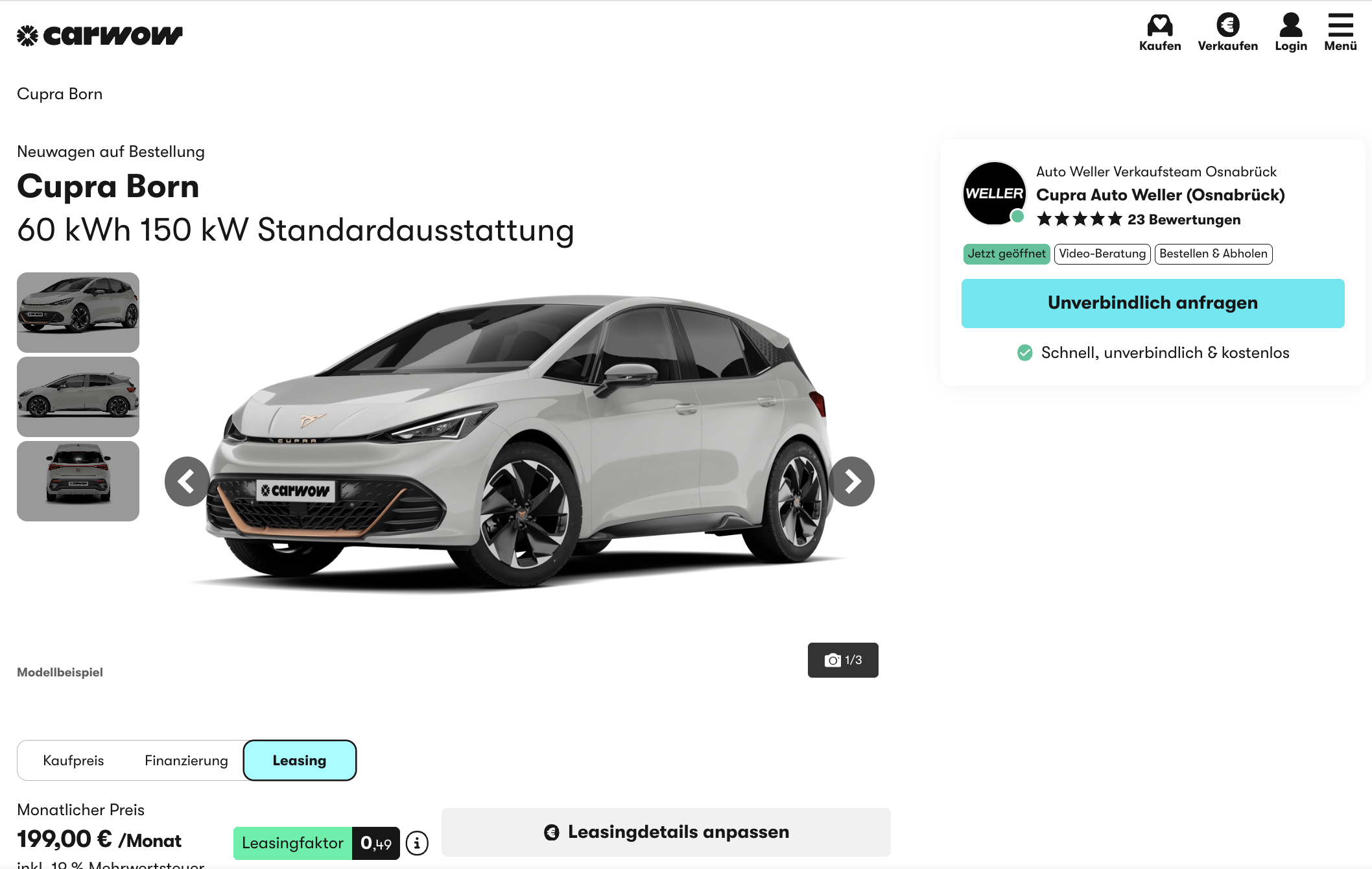 Das carwow-Angebot ist auf 36 Monate Laufzeit und 10.000 Kilometer pro Jahr ausgelegt. Im direkten Preisvergleich wird der Vorteil deutlich: Während ein ähnlich konfigurierter Born bei großen Mitbewerbern oft rund 370 Euro brutto monatlich kostet, liegt die effektive Rate hier deutlich darunter.