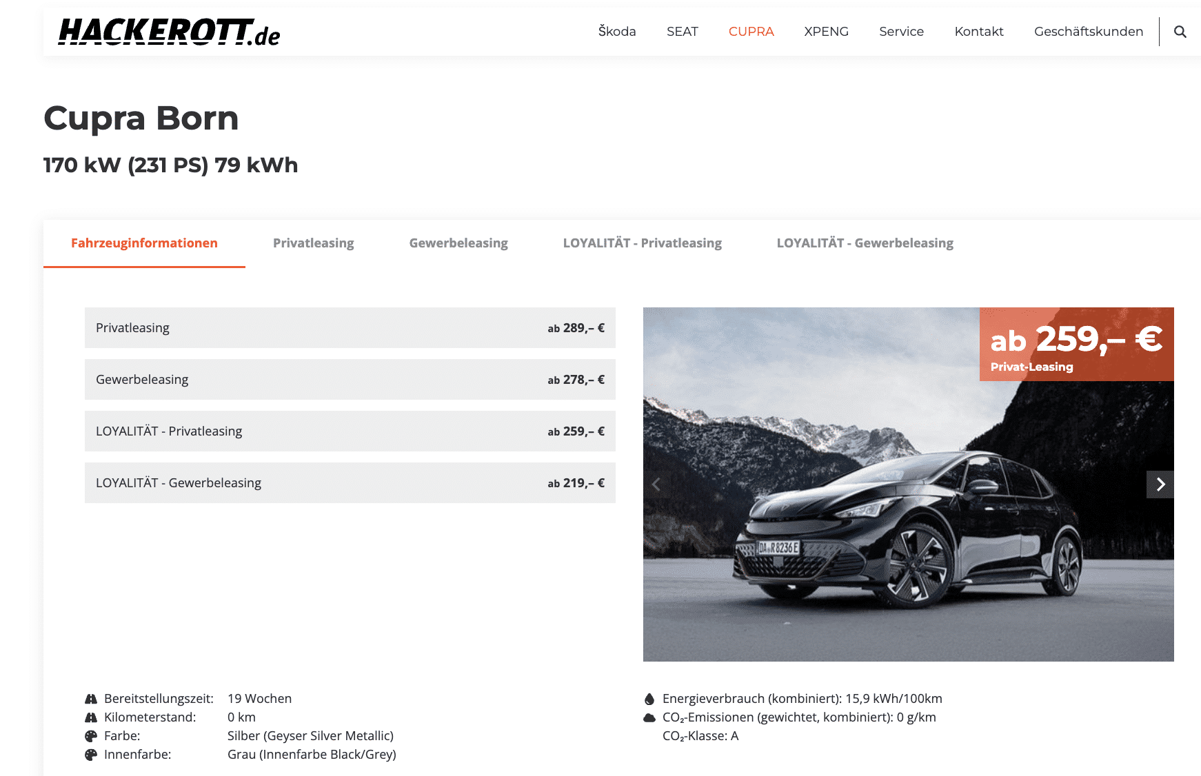 Das Hackerott-Leasing läuft über 48 Monate mit 10.000 km pro Jahr, transparent kalkuliert, sauber planbar. Der Blick über den Tellerrand bestätigt die Schärfe des Angebots: Beim Marktführer wird ein vergleichbar konfigurierter Born derzeit mit 355 € brutto/Monat gelistet. Bedeutet mindestens ~66 € Ersparnis pro Monat, mit Loyalitätsvorteil sogar bis zu ~96 €.