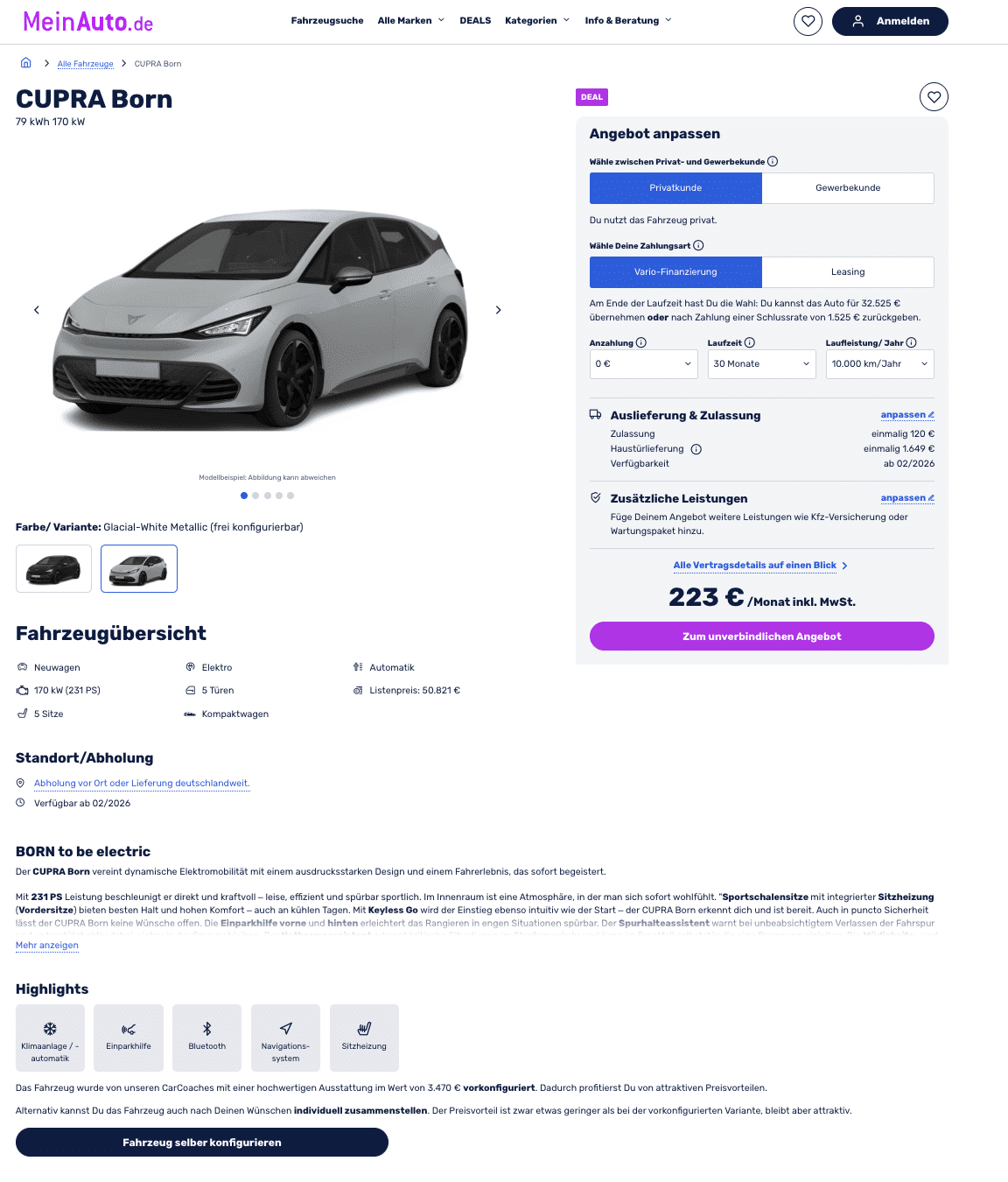 Ein Angebot mit Spielraum: Bei MeinAuto fährst du den CUPRA Born mit großem Akku (≈77 kWh netto) und 170 kW (231 PS) im Vario-Leasing schon ab 223 € brutto pro Monat. Nach Laufzeitende bleibt die Wahl ganz bei dir: übernehmen für 32.525 € oder den Wagen nach Zahlung einer Schlussrate von 1.525 € einfach zurückgeben. Wer lieber klassisch kalkuliert, bekommt den Born alternativ für 273 € brutto/Monat im Standard-Leasing. Das Fahrzeug ist vorkonfiguriert, Auslieferung ab Februar 2026 – auf Wunsch mit individueller Anpassung.