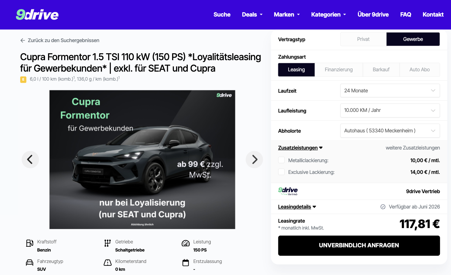 Sportlicher Auftritt, ungewöhnlich niedrige Rate! Der Cupra Formentor 1.5 TSI 110kW bei 9Drive für 99 Euro netto im Monat ist ein Angebot, das in dieser Form sofort auffällt. Ein kompakt gezeichnetes SUV mit eigenständigem Design, ordentlicher Motorisierung und Leasingfaktor von 0,28 ist in dieser Preisregion alles andere als selbstverständlich. Voraussetzung ist die Loyalitätsprämie, sie gilt für alle, die seit mindestens sechs Monaten einen SEAT oder CUPRA fahren, unabhängig davon, ob das Fahrzeug geleast oder gekauft wurde. Gleichzeitig bleibt der Formentor als frei konfigurierbares Bestellfahrzeug flexibel, Farbe und Ausstattung lassen sich also noch anpassen. Die Verfügbarkeit ist ab Juni 2026 vorgesehen.