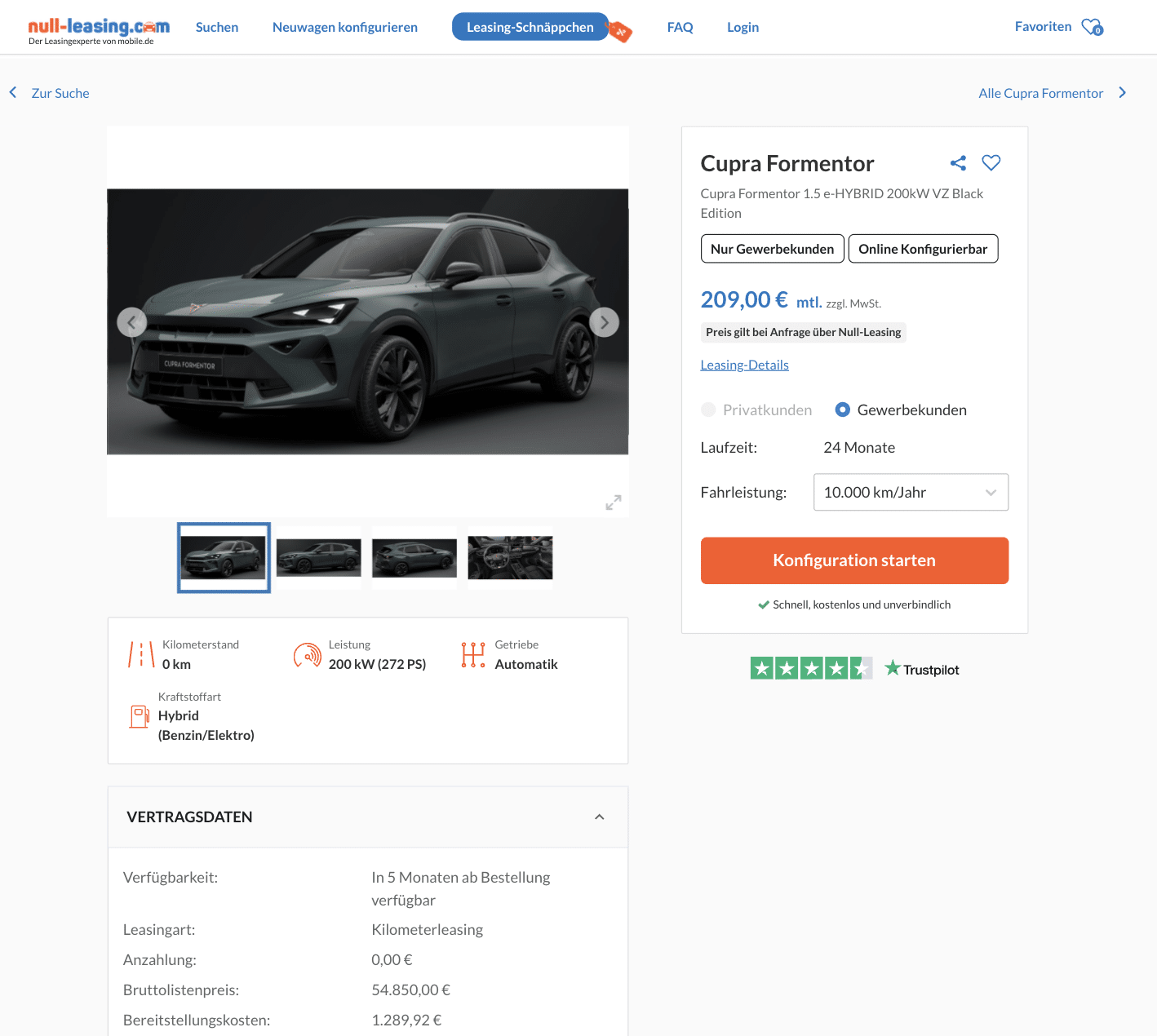 Der Cupra Formentor VZ 1.5 e-Hybrid 200 kW DSG ist die Antwort auf die Frage, wie man sportlich, leise und betriebswirtschaftlich klug unterwegs ist. Für Geschäftskunden steht er als Bestellfahrzeug zu 209 € netto/Monat bereit, 24 Monate, 10.000 km Laufleistung pro Jahr. Es ist eine Bestellaktion, bei der ihr das Fahrzeug individuell zusammenstellen könnt. Die Lieferzeit beträgt fünf Monate.