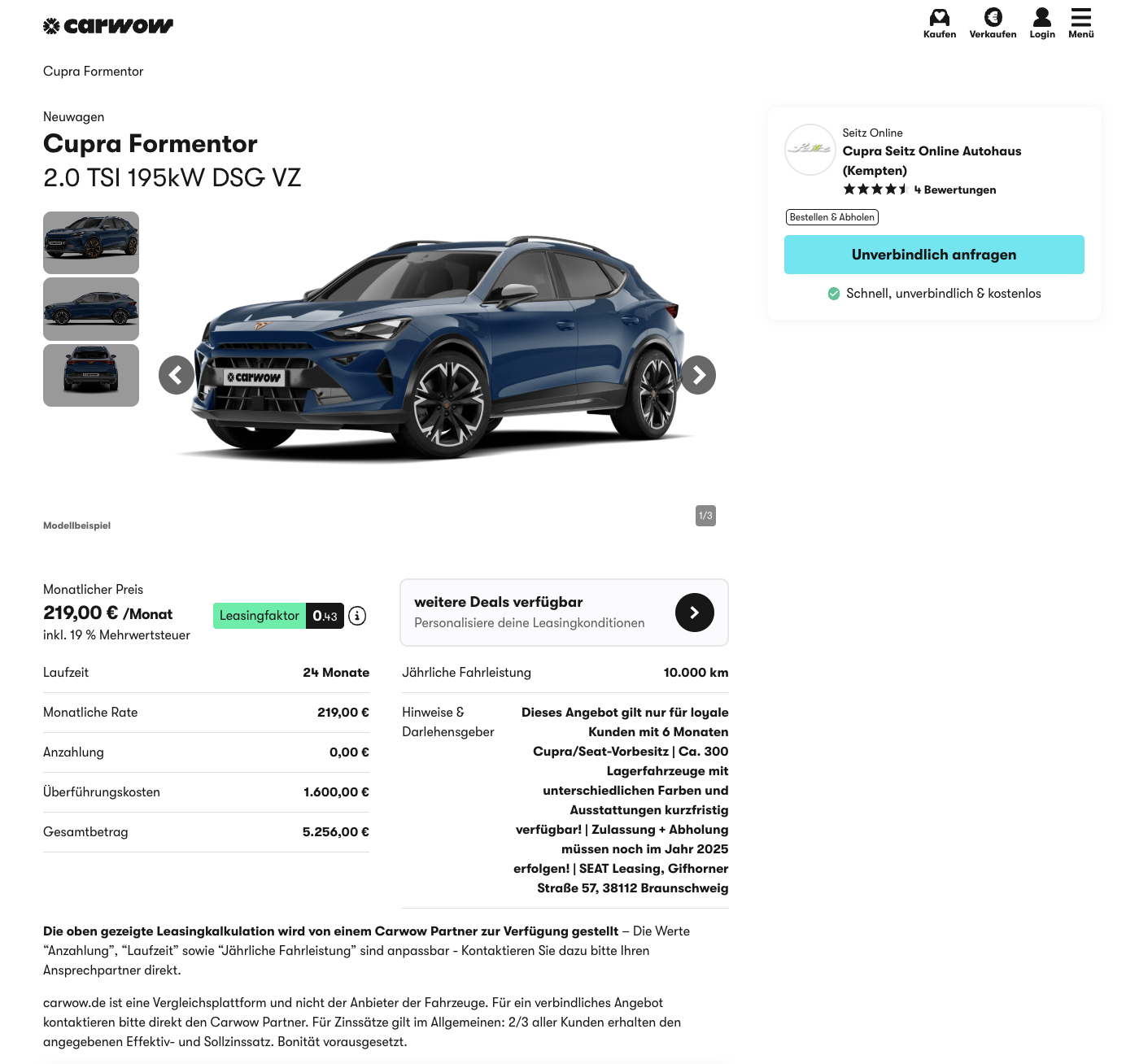 Bissiges Performance-SUV mit großem Alltagstalent und diesem typischen CUPRA-Punch. CUPRA Formentor VZ 2.0 TSI 4Drive DSG bei carwow für 219 € brutto/Monat im Privatleasing, alternativ 129 € netto/Monat im Geschäftsleasing, Loyalitätsbonus inklusive für alle, die mindestens sechs Monate SEAT oder CUPRA gefahren sind. Rund 300 Lagerfahrzeuge stehen kurzfristig bereit, Farben und Ausstattungen variieren, Zulassung spätestens bis 30.10.2025. Die Beispielkalkulation läuft über 24 Monate und 10.000 km/Jahr.