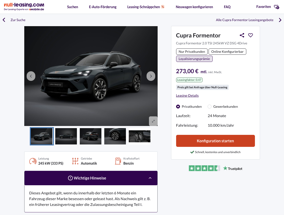 Cupra Formentor VZ im Leasing als Bestellfahrzeug für 273 Euro im Monat brutto [Loyalitätsprämie]