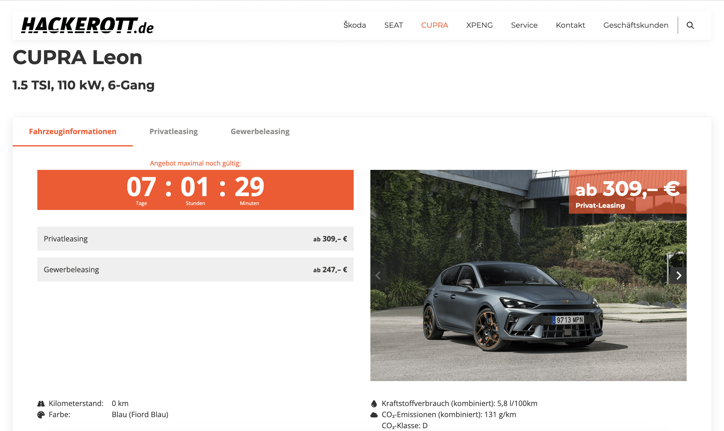 Andere Anbieter verlangen für den CUPRA Leon in vergleichbarer Ausstattung 330 Euro brutto pro Monat. Damit liegt Hackerott über 20 Euro günstiger – was sich über die gesamte Laufzeit auf fast 1.000 Euro Ersparnis summiert.