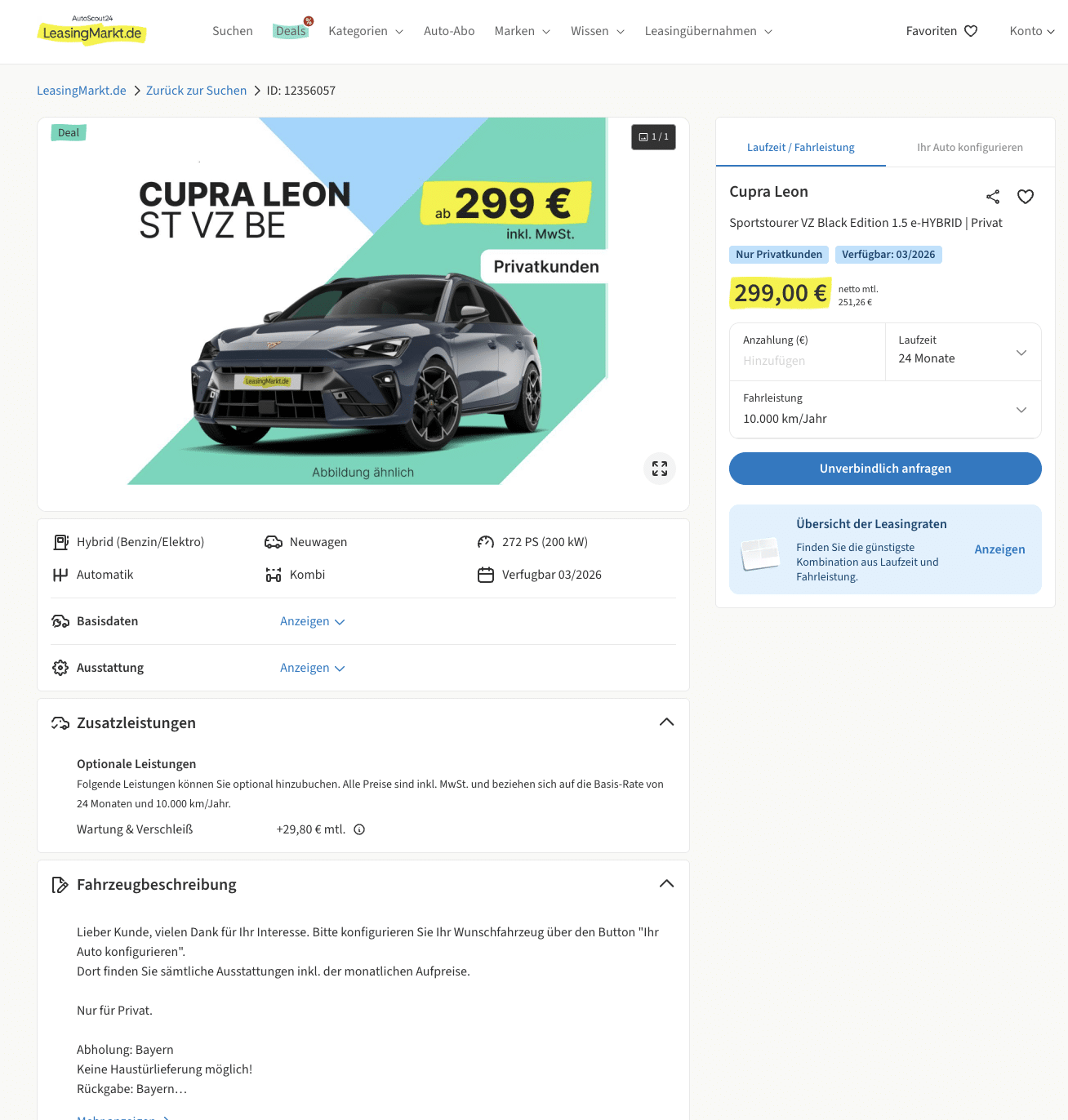 Ihr wollt Performance, Praktikabilität und Kostenkontrolle in einem Paket? LeasingMarkt legt euch den CUPRA Leon Sportstourer 1.5 e-Hybrid DSG VZ Black Edition für 299 Euro brutto pro Monat hin, kalkuliert auf 24 Monate und 10.000 km/Jahr. Es handelt sich um ein frei konfigurierbares Bestellfahrzeug, sodass Lack, Räder und Pakete exakt zu eurem Profil passen. Die Auslieferung ist ab März 2026 vorgesehen – Planungssicherheit inklusive.