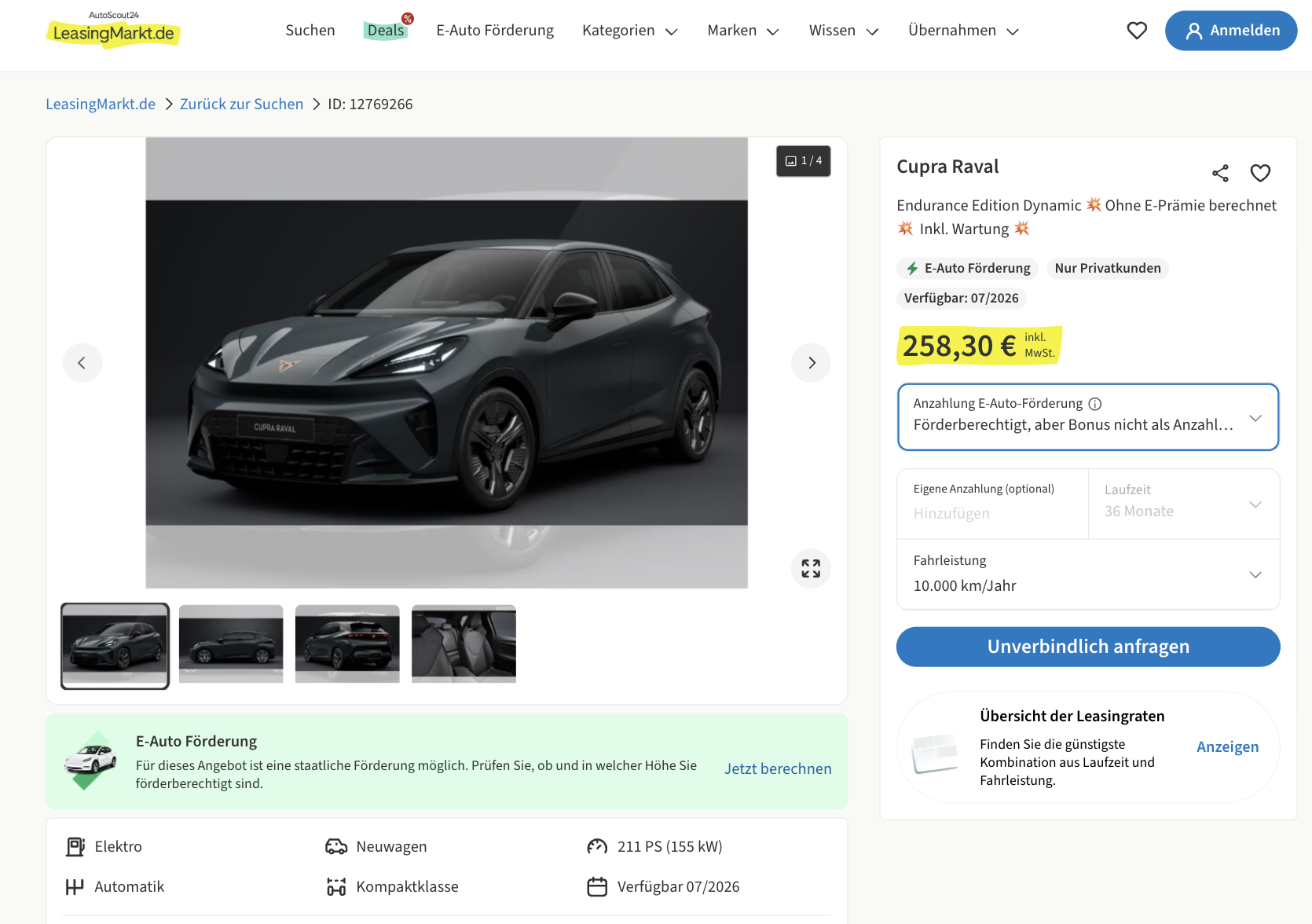 Mit dem Raval bringt Cupra ein neues, vollelektrisches Modell an den Start, das bewusst auf urbane Nutzung und sportliche Optik setzt. Cupra Raval Endurance Edition Dynamic bei LeasingMarkt für 258,30 Euro brutto im Monat ist eines der ersten verfügbaren Angebote. Die Kalkulation erfolgt ohne E-Prämie, dafür ist das Wartung Plus Paket bereits enthalten. Konfiguriert wird individuell, es handelt sich um ein Bestellfahrzeug.