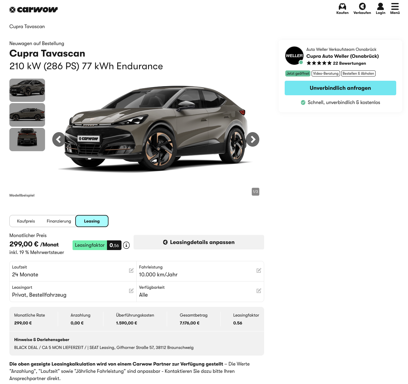 Ein Elektro-SUV, das sich nicht brav gibt, sondern nach CUPRA aussieht und sich auch so anfühlt. CUPRA Tavascan Endurance 210 kW 77 kWh bei carwow für 299 Euro brutto im Monat, als frei konfigurierbares Bestellfahrzeug, Lack, Felgen, Pakete und Assistenten gehen komplett nach euren Prioritäten. Die Lieferzeit liegt bei rund fünf Monaten, also planbar, ohne dass es ewig dauert.