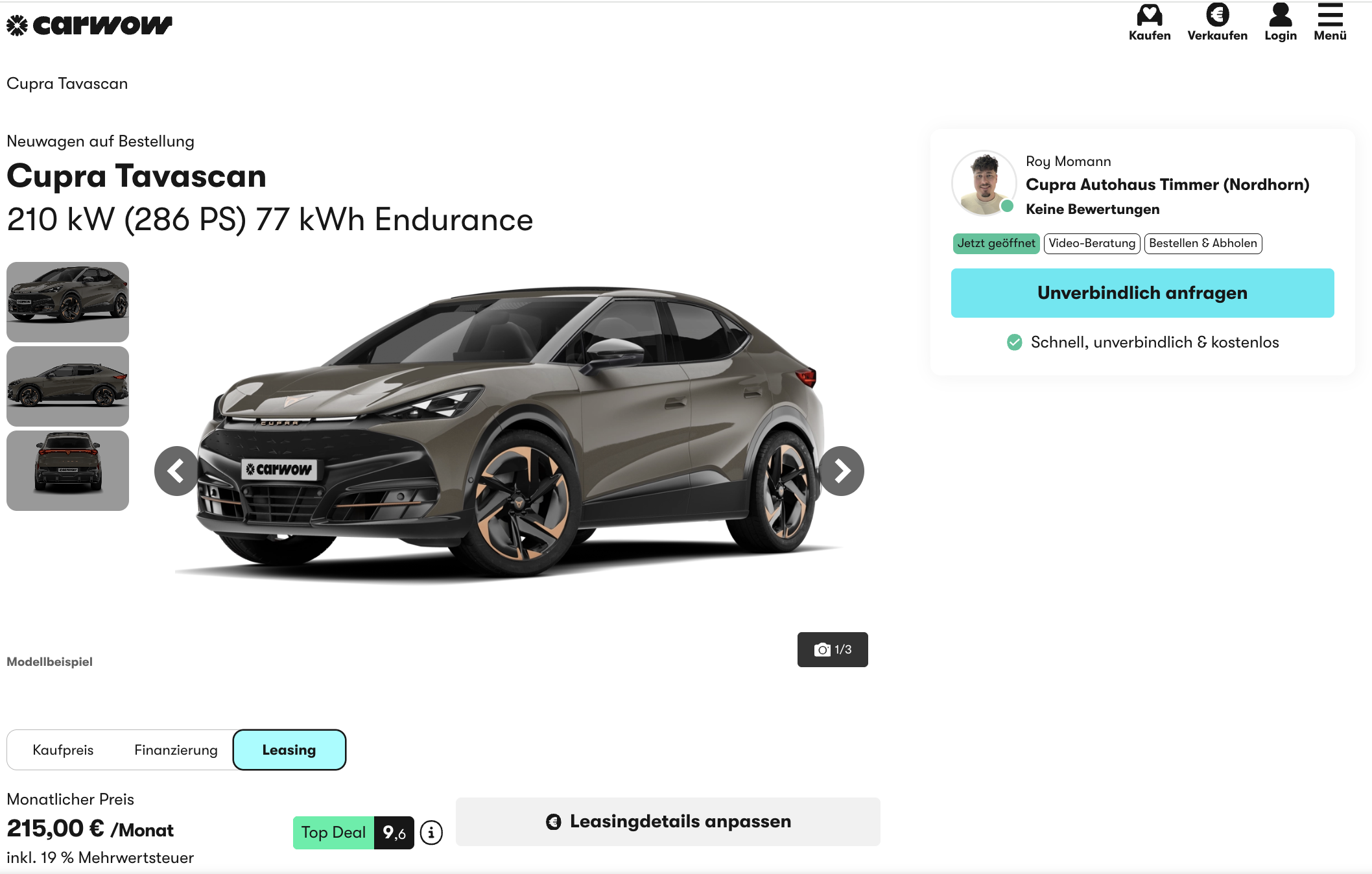 Der Cupra Tavascan vereint Dynamik, Reichweite und Design in einem Format, das sowohl im Alltag als auch auf langen Strecken überzeugt. Bei carwow ist der Cupra Tavascan 210 kW 77 kWh Endurance ab 215 Euro brutto im Monat erhältlich. Dieser attraktive Preis beinhaltet eine Sonderzahlung von 6.000 Euro, die im Rahmen der Umweltprämie idealerweise vollständig erstattet werden kann.