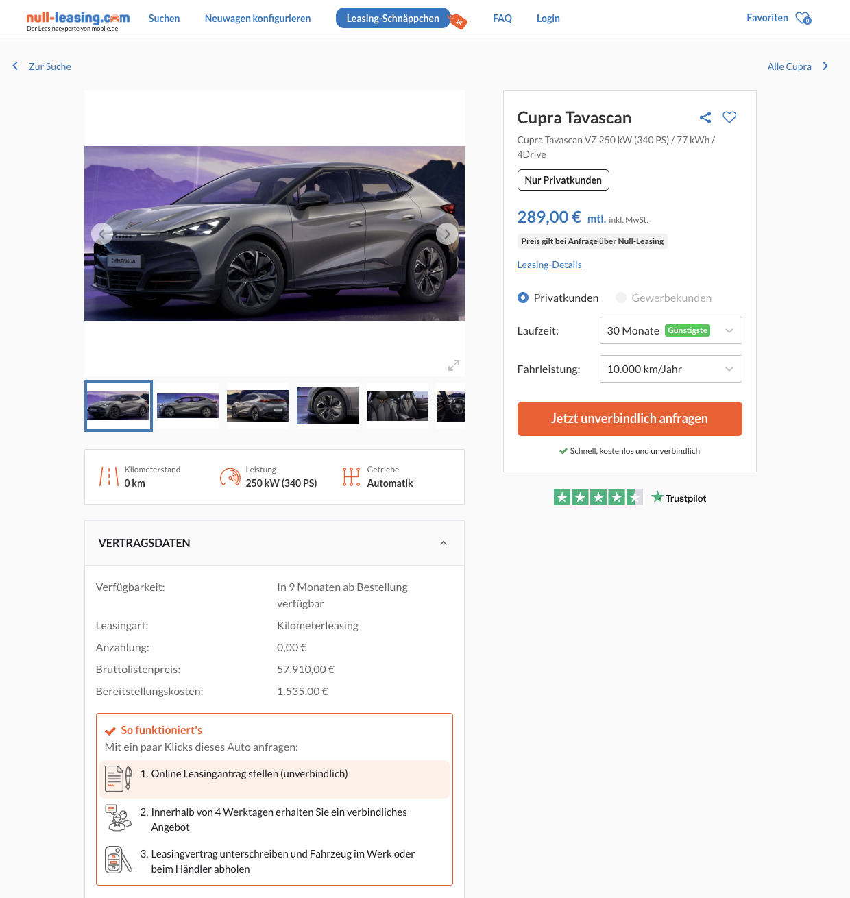 Die Beispielkalkulation, die wir als Referenz heranziehen, läuft bei carwow über 30 Monate mit 10.000 km pro Jahr, Laufzeit und Kilometer könnt ihr anpassen, damit die Rate zu eurem Fahrprofil passt. Fürs Marktgefühl lohnt der Blick zum Platzhirsch, dort wird der CUPRA Tavascan VZ aktuell um 369 Euro brutto pro Monat geführt, dadurch gewinnt der 289-Euro-Einstieg bei Null-Leasing zusätzlich an Strahlkraft. Unterm Strich bekommt ihr ein emotional gezeichnetes SUV mit hohem Alltagsnutzen, kräftigem Allrad-Punch und einem Cockpit, das modern aussieht und sich logisch bedienen lässt. Wer eine klare Preisansage, eine starke Ausstattung und echte Konfigurationsfreiheit sucht, findet hier ein Paket, das im täglichen Pendelbetrieb überzeugt und am Wochenende Lust auf Strecke macht.