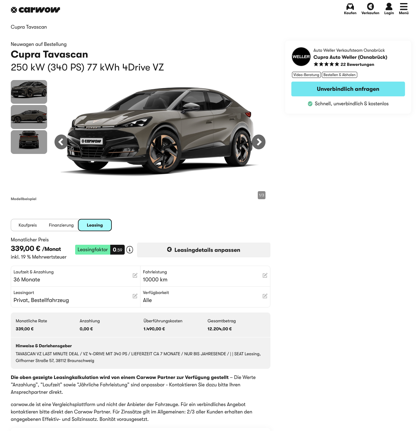 Kalkuliert ist das Angebot mit 36 Monaten und 10.000 Kilometern pro Jahr. Im Vergleich liegt ein ähnlich konfigurierter Tavascan beim Platzhirsch bei rund 381 Euro brutto pro Monat, hier seid ihr deutlich günstiger unterwegs.