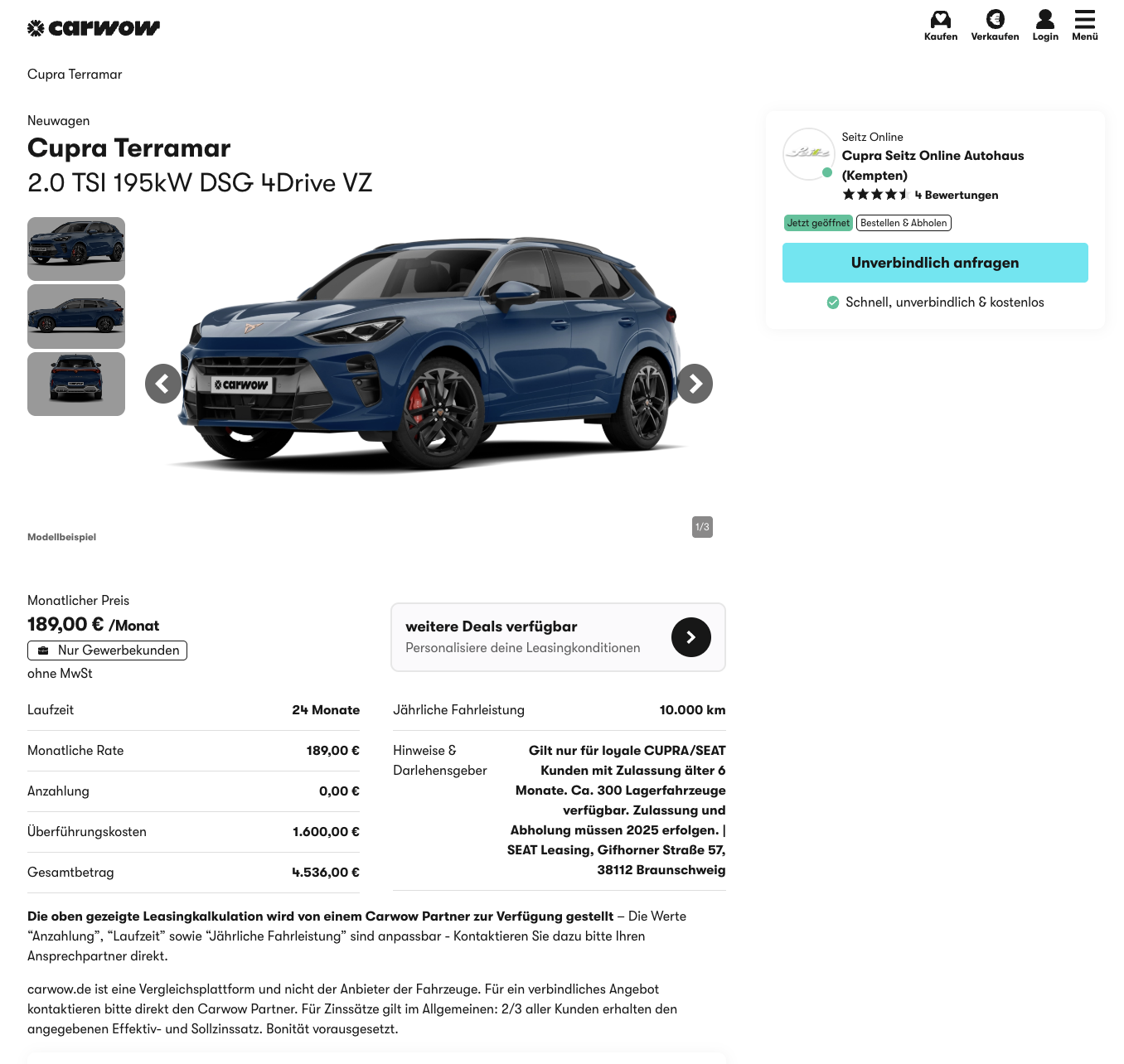 Scharfe Linien, sattes Drehmoment und Allradantrieb, ein Cupra-SUV mit Punch! Bei carwow können Geschäftskunden aktuell den Cupra Terramar VZ 2.0 TSI 195 kW DSG 4Drive für schlanke 189 € brutto/Monat leasen, inklusive Loyalitätsprämie. Voraussetzung der Prämie ist, dass ihr mindestens sechs Monate einen SEAT oder CUPRA fahrt oder gefahren seid, egal ob geleast oder gekauft. Es warten mindestens 300 Lagerfahrzeuge auf euch, die Zulassung und Abholung erfolgen 2025, die Kalkulation steht auf 24 Monaten und 10.000 km pro Jahr, beides lässt sich anpassen.