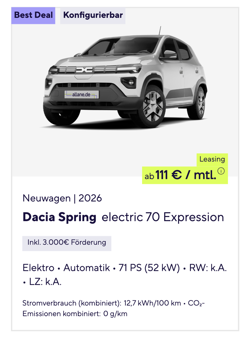 Der Dacia Spring Electric 70 Expression bei Allane für 111 Euro brutto im Monat ist eines dieser Angebote, die vor allem durch ihre klare Ausrichtung überzeugen. Hier geht es nicht um großes Prestigedenken oder überladene Technik, sondern um einen günstigen und überschaubaren Einstieg in die Elektromobilität. Gerade für alle, die ein Elektroauto zunächst ausprobieren möchten, ohne sich schon heute dauerhaft festzulegen, wirkt dieses Modell besonders interessant. Kalkuliert ist das Angebot mit 3.000 Euro Anzahlung, 36 Monaten Laufzeit und 10.000 Kilometern pro Jahr. Gleichzeitig handelt es sich um ein frei konfigurierbares Bestellfahrzeug, wodurch noch Spielraum bei der individuellen Zusammenstellung bleibt.