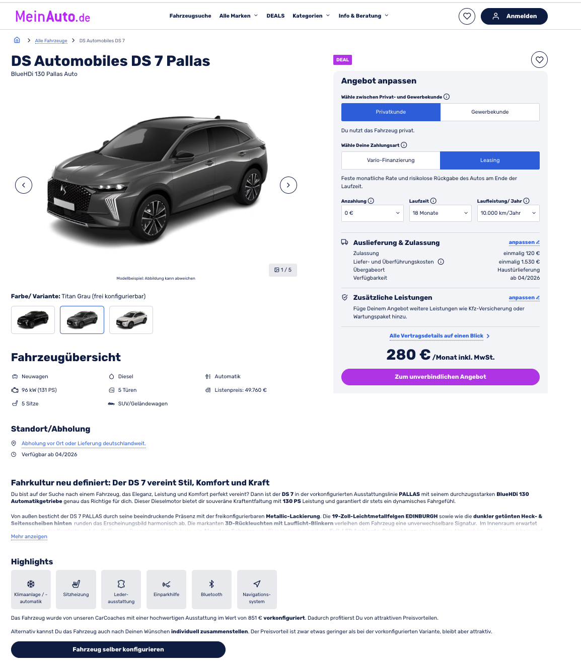 Souveränes Komfort-SUV mit Pariser Charme. Den DS 7 BlueHDi 130 Auto Pallas könnt ihr bei MeinAuto für 253 € brutto/Monat leasen, als Bestellfahrzeug mit voller Konfigurationsfreiheit, kalkuliert auf 18 Monate und 10.000 km/Jahr. Die Überführung inkl. Zulassung und Haustürlieferung kostet 1.650 €, die Auslieferung ab April 2026 lässt sich passgenau in euren Fuhrparkkalender einplanen.