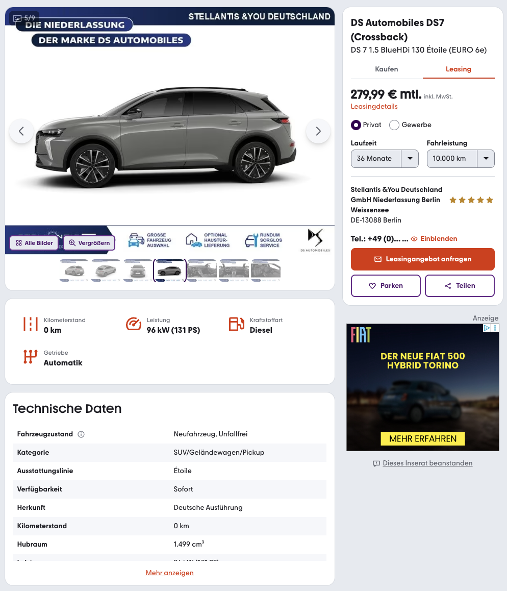 Die Kalkulation des Angebots liegt bei 36 Monaten Laufzeit und 10.000 Kilometern Fahrleistung pro Jahr, beides lässt sich anpassen. Beim Blick auf den Markt wird der Reiz noch klarer, denn der Platzhirsch verlangt für einen vergleichbaren DS 7 rund 631 Euro brutto im Monat, hier liegt die Rate deutlich darunter, die Ersparnis bewegt sich bei über fünfzig Prozent.