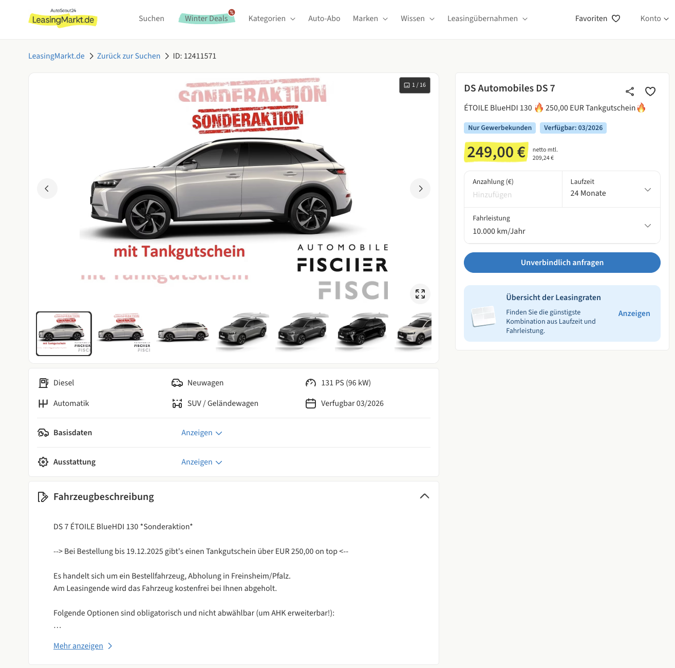 Sichert euch den DS 7 BlueHDi 130 Auto Étoile bei LeasingMarkt im Geschäftsleasing für 209,24 Euro netto im Monat, kalkuliert mit 24 Monaten Laufzeit und 10.000 Kilometern pro Jahr. Wer bis zum 19.12.2025 bestellt, bekommt zusätzlich einen Tankgutschein über 250 Euro obendrauf.