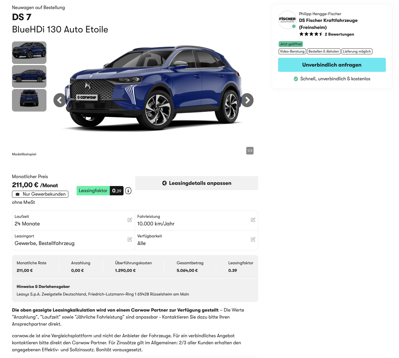 Der DS 7 ist ein SUV für Geschäftskunden, die nicht nur Kilometer abspulen wollen, sondern dabei auch Wert auf Stil und Ruhe legen. DS Automobiles DS 7 BlueHDi 130 Auto Étoile bei carwow für 211 Euro netto im Monat, als frei konfigurierbares Bestellfahrzeug, damit lässt sich die Ausstattung passend zum Fuhrpark zusammenstellen, statt irgendeinen Kompromiss zu nehmen.