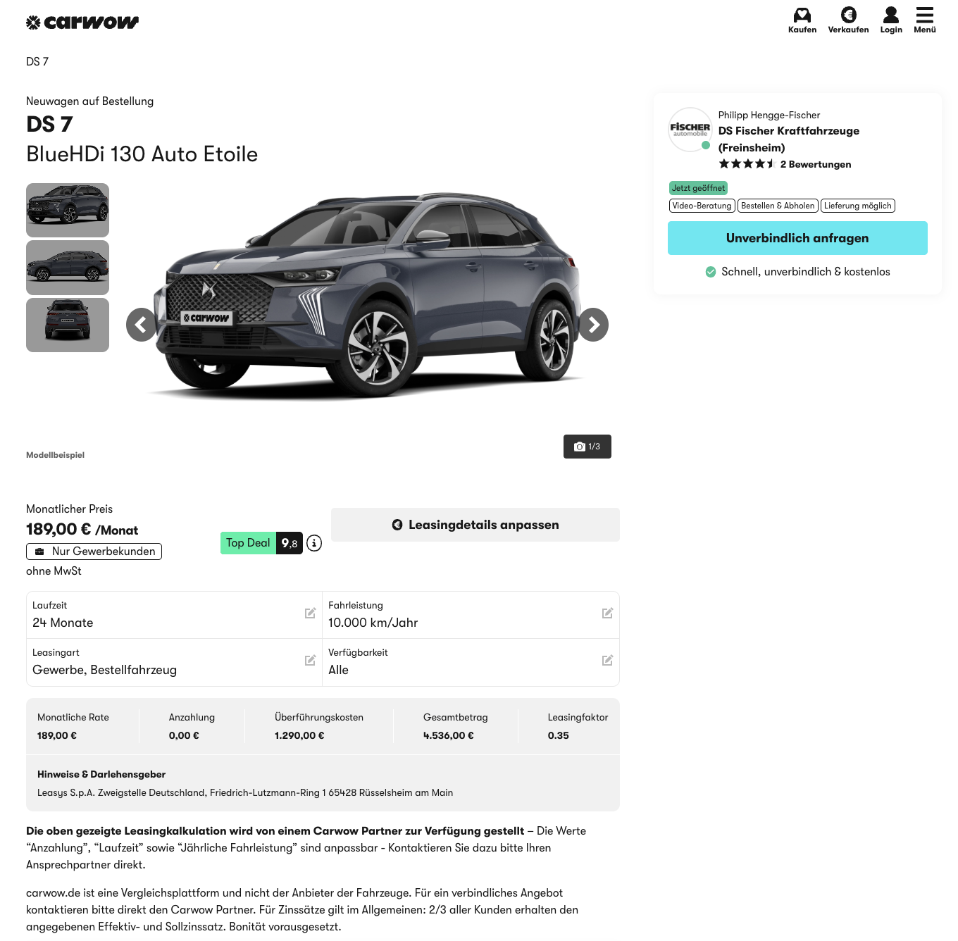 Das Angebot ist auf 24 Monate Laufzeit und 10.000 Kilometer pro Jahr gerechnet, Anpassungen sind in der Regel möglich. Im Vergleich zu anderen Listungen wird der Vorteil greifbar. Wenn der Platzhirsch für den DS 7 BlueHDi 130 rund 283 Euro netto pro Monat aufruft, wirkt die Rate von 189 Euro netto wie ein deutliches Plus auf der Budgetseite, ohne dass beim Fahrzeuganspruch nach unten korrigiert werden muss.