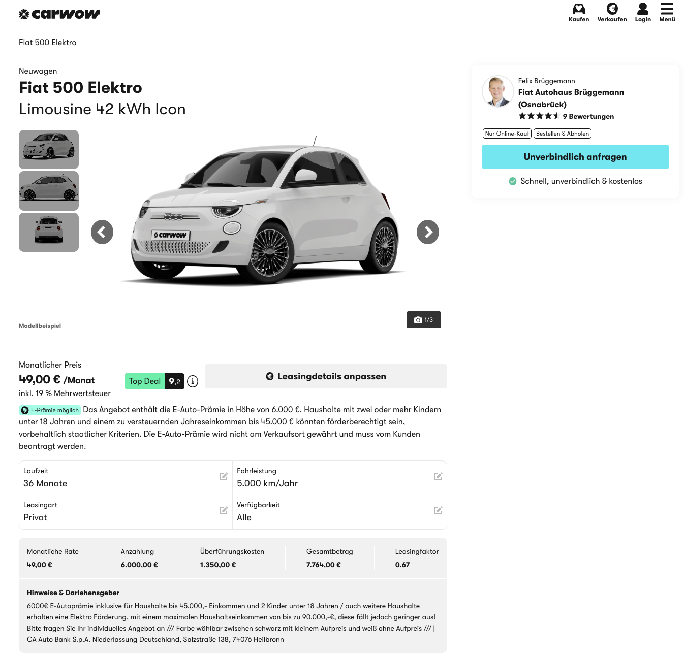 Retro-Charme trifft Elektroalltag, Fiat 500e 42 kWh Icon bei carwow für 49 Euro brutto im Monat leasen. Diese Rate entsteht nicht „einfach so“, sondern durch eine Sonderzahlung von 6.000 Euro, die im Angebot als Umweltprämie angesetzt wird. Danach kann, wenn alle Bedingungen erfüllt sind und der Antrag durchgeht, ein Teil oder sogar die volle Summe vom Staat zurückkommen. Wichtig ist außerdem, dass es sich um ein frei konfigurierbares Bestellfahrzeug handelt, Farbe und Optionen lassen sich also passend zum eigenen Geschmack zusammenstellen, statt irgendeinen Lagerwagen zu nehmen.