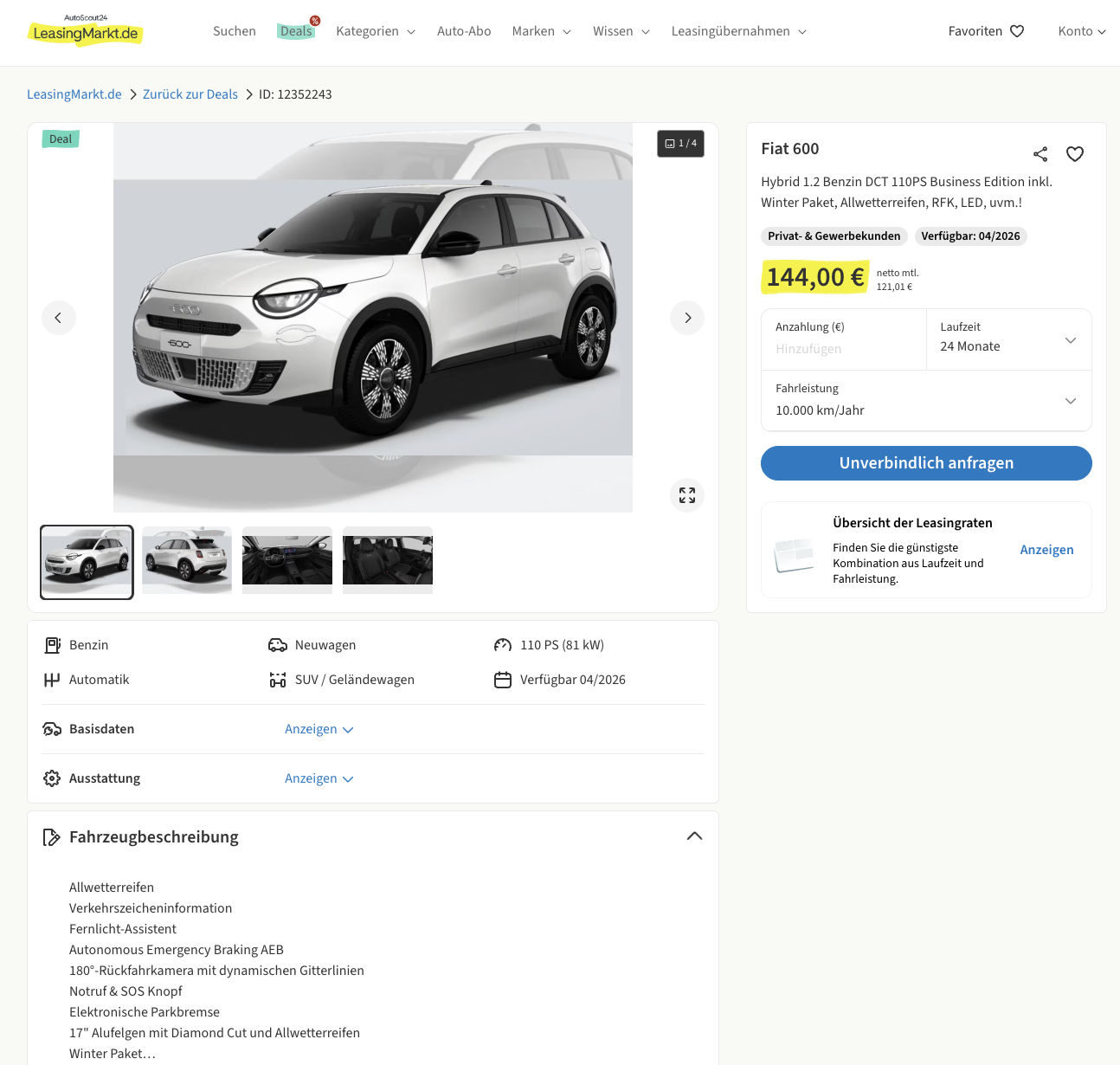 Für Privatkunden ist das Angebot auf 24 Monate und 10.000 Kilometer pro Jahr gerechnet. Der Vergleich macht den Unterschied deutlich, denn beim Marktführer werden rund 325 Euro brutto aufgerufen. Mit 144 Euro brutto liegt dieses LeasingMarkt Angebot klar darunter, und genau das macht den Fiat 600 Business Edition aktuell so interessant, viel Auto fürs Geld, ohne komplizierte Bedingungen.