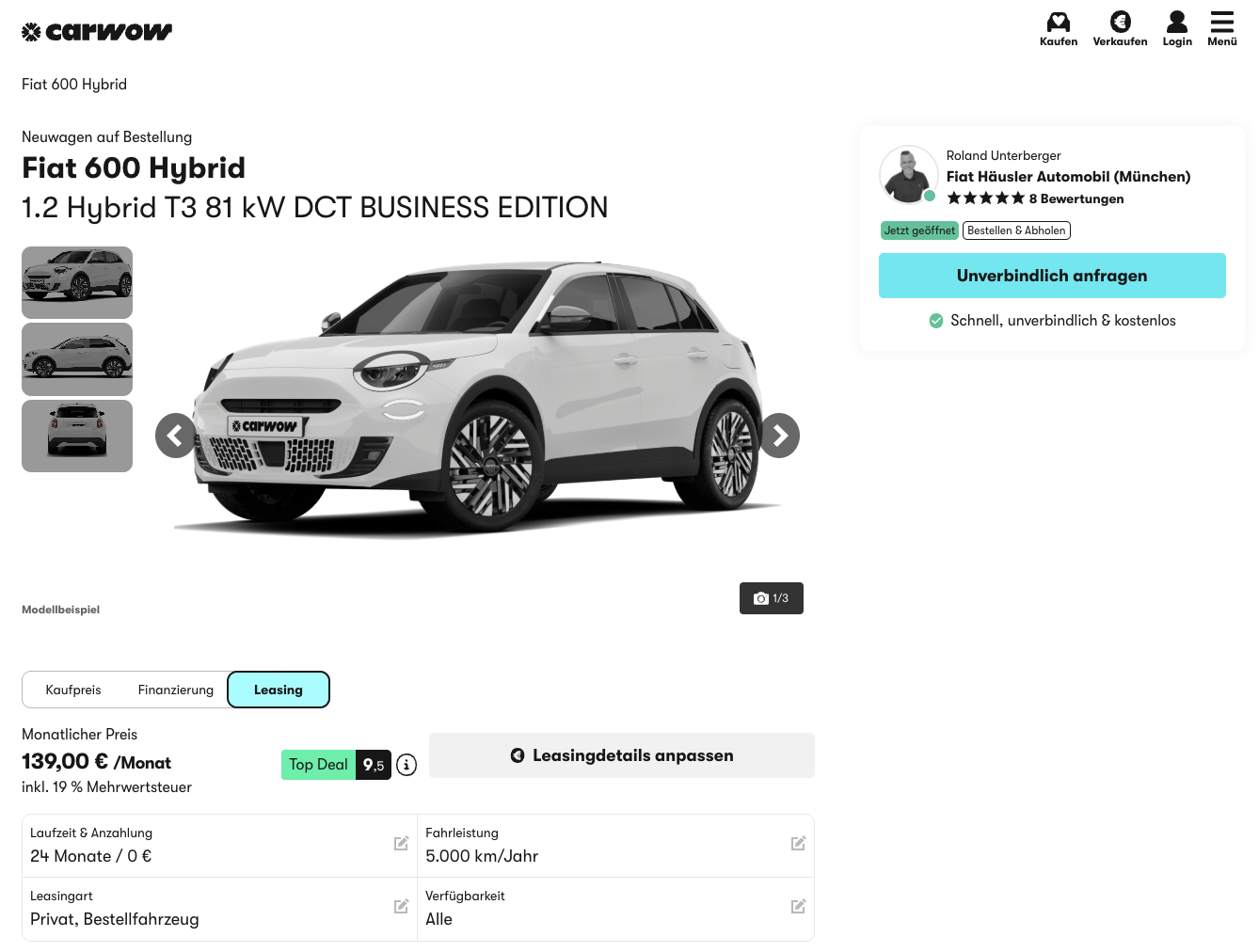 Kalkuliert ist das Angebot mit 24 Monaten Laufzeit und 5.000 Kilometern pro Jahr. Wer mehr Fahrleistung braucht, landet bei 10.000 Kilometern pro Jahr bei 189 Euro brutto monatlich. Spätestens im direkten Vergleich wird klar, warum dieser Deal auffällt. Wenn ein ähnlicher Fiat 600 beim Marktführer aktuell bei rund 418 Euro brutto pro Monat liegt, dann spielt dieses Angebot in einer ganz anderen Liga. Genau deshalb ist der Fiat 600 hier nicht nur ein sympathischer Begleiter für den Alltag, sondern auch ein Deal, der preislich erstaunlich stark dasteht.
