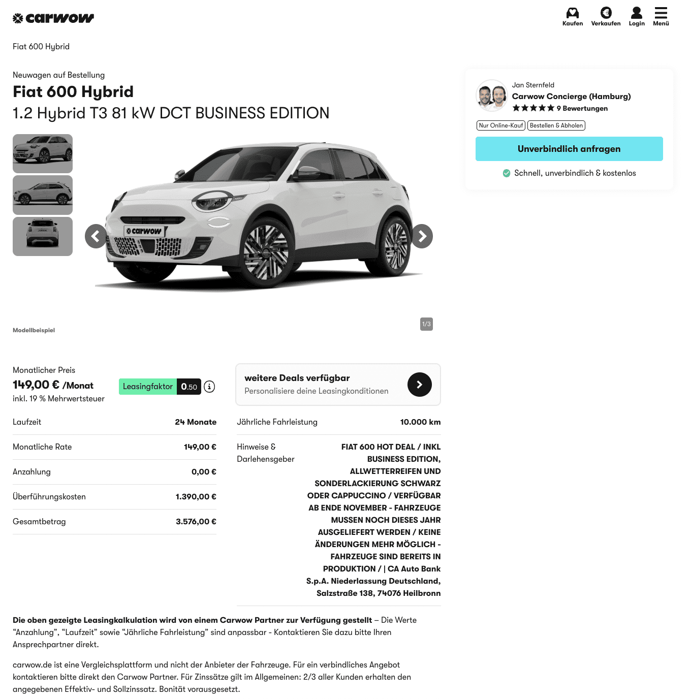 Besonders attraktiv ist der Preisvergleich: Während andere Anbieter für den Fiat 600 aktuell rund 320 Euro brutto im Monat verlangen, liegt ihr hier bei gerade einmal 149 Euro brutto. Das ist weniger als die Hälfte, bei identischer Ausstattung und Antrieb.