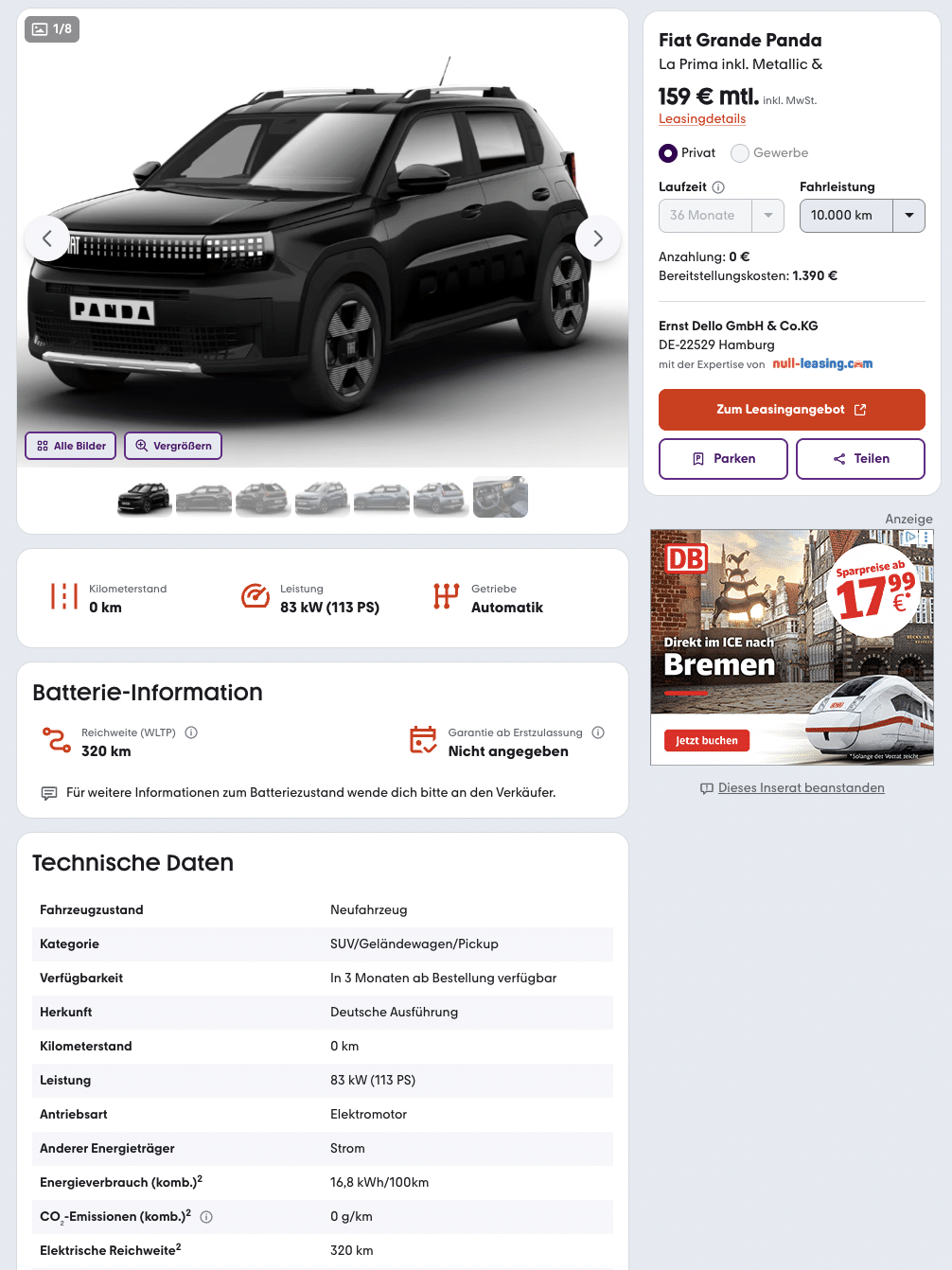 Das Angebot ist auf 36 Monate Laufzeit und 10.000 Kilometer pro Jahr kalkuliert. Noch beeindruckender ist der Preisvergleich: Während der Marktführer aktuell rund 403 Euro brutto monatlich verlangt, sichert ihr euch den Grande Panda hier für weniger als die Hälfte.