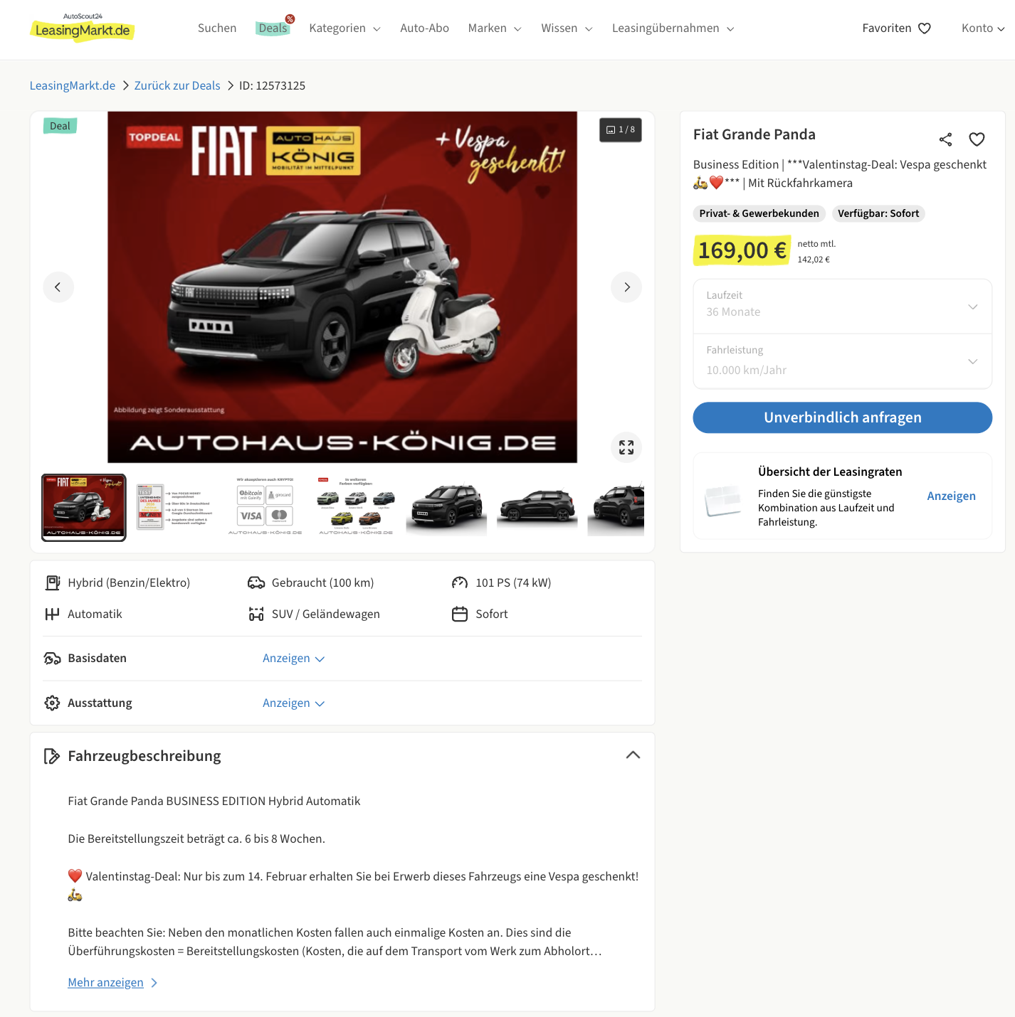 Der Fiat Grande Panda ist zurück, kantig, selbstbewust und unkompliziert. Genau so ist auch dieses Angebot aufgebaut. Fiat Grande Panda Hybrid 1.2 Business Edition bei LeasingMarkt für 169 Euro im Monat kombiniert einen günstigen Einstieg mit einem ungewöhnlichen Bonus. Es handelt sich um ein Fahrzeug mit Tageszulassung, die Erstzulassung erfolgte im Dezember 2025, der Kilometerstand liegt bei rund 100 Kilometern. Als zeitlich begrenzte Aktion gibt es bis zum 14. Februar zusätzlich eine Vespa 50 ccm geschenkt. Farblich reicht die Auswahl von Cinema Schwarz über Acqua Blau und Gelato Weiß bis hin zu Lago Blau, Limone Gelb und Luna Bronze, sodass sowohl zurückhaltende als auch auffällige Varianten möglich sind.