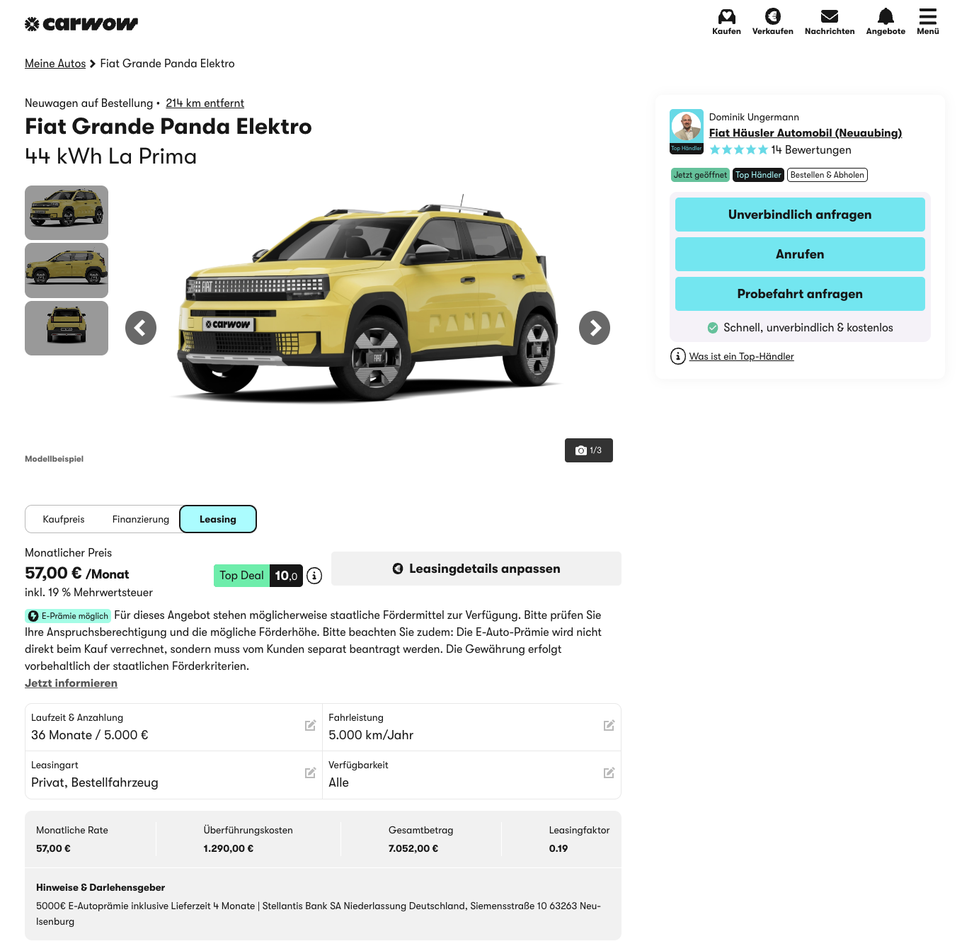 Der Fiat Grande Panda zeigt, dass ein Elektroauto nicht teuer oder kompliziert sein muss, um im Alltag zu überzeugen. Fiat Grande Panda 44 kWh La Prima bei carwow für 57 Euro brutto im Monat klingt zunächst fast nach einem klassischen Lockangebot, tatsächlich steckt hier aber ein interessanter Deal für alle, die einen modernen Stromer zu überschaubaren Monatskosten suchen. Möglich wird die niedrige Rate durch eine Sonderzahlung von 5.000 Euro, die über die Umweltprämie kalkuliert ist und je nach Anspruch teilweise oder sogar vollständig zurückfließen kann. Wer diese Summe fair auf die Laufzeit verteilt, landet bei einer normalisierten Rate von 195,89 Euro brutto pro Monat. Bestellt wird der Grande Panda frei konfigurierbar, die Lieferzeit liegt aktuell bei rund vier Monaten.