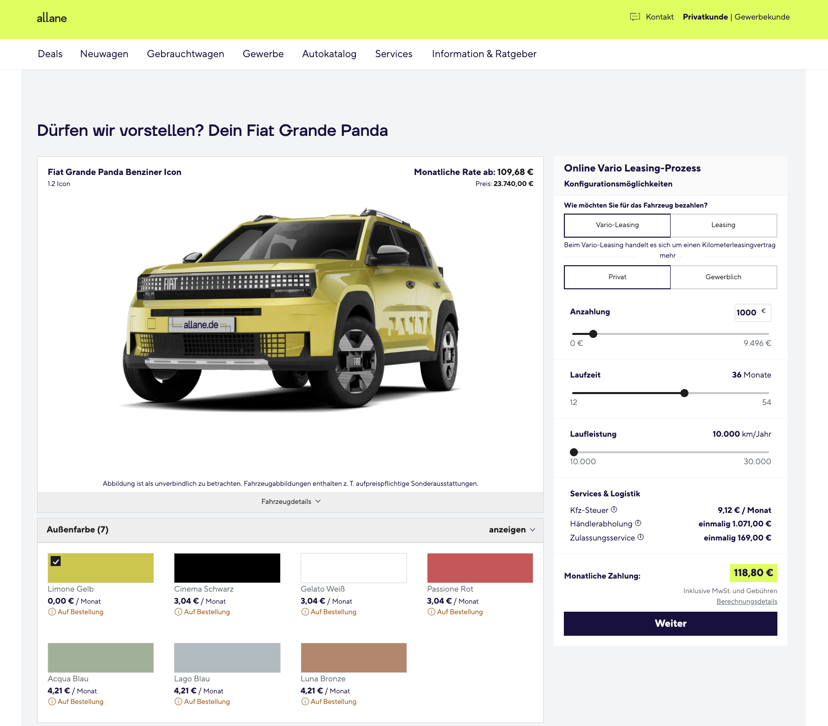 Der Fiat Grande Panda will nicht einfach nur günstig sein. Er möchte ein moderner Kleinwagen sein, der im Alltag funktioniert, ordentlich aussieht und bei der Finanzierung mehr Flexibilität bietet als ein klassisches Leasingmodell. Fiat Grande Panda 1.2 Icon bei Allane für 118,80 Euro brutto im Monat passt genau in dieses Profil. Gerechnet wurde das Angebot mit 1.000 Euro Vorauszahlung, hinzu kommen 169 Euro für den Zulassungsservice sowie 1.071 Euro Überführungskosten. Das Fahrzeug ist in verschiedenen Farben bestellbar, die Lieferzeit liegt bei rund vier Monaten.