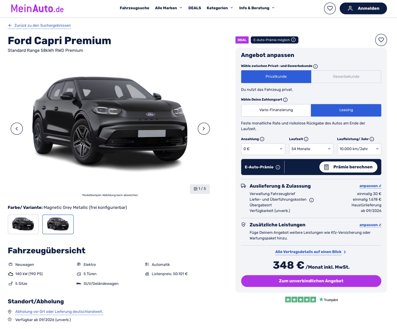 Ford Capri im Leasing als Bestellfahrzeug für 348 Euro im Monat brutto