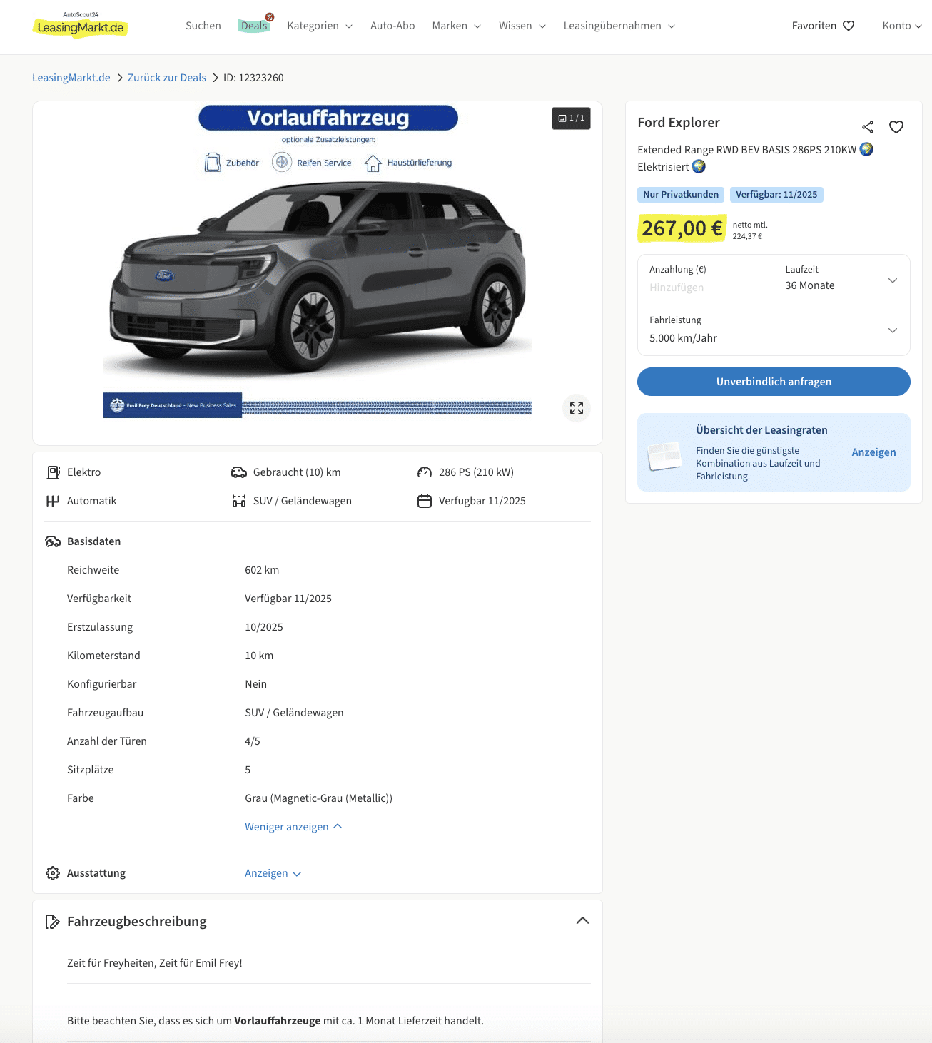 LeasingMarkt hat den Deal, der euch geradeaus ins elektrische Abenteuer schickt! Der Ford Explorer Elektro Extended Range 77 kWh RWD steht als Tageszulassung (Oktober 2025) mit nur 10 km Laufleistung ab 267 Euro brutto im Monat bereit, im Geschäftskunden-Tarif ab 215,13 Euro netto. Das Fahrzeug ist in etwa einem Monat verfügbar.