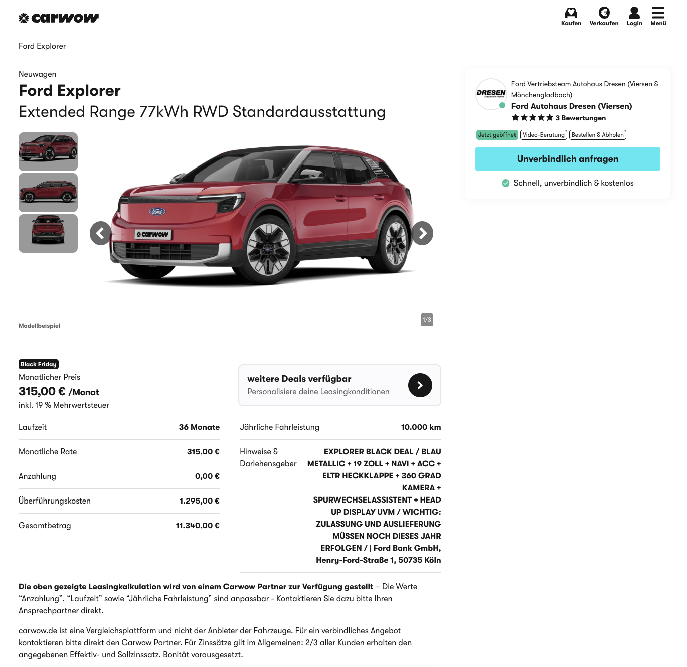 Ein großes Elektro-SUV ohne Showeffekte, dafür mit klaren Zahlen. Ford Explorer Elektro Extended Range 77 kWh RWD in Blau Metallic bei carwow für 315 Euro brutto im Monat, als sofort verfügbarer Neuwagen. Das Beispielangebot ist auf 36 Monate und 10.000 Kilometer pro Jahr ausgelegt, die Rahmenwerte können bei Bedarf angepasst werden, wenn mehr oder weniger Laufleistung sinnvoll ist.