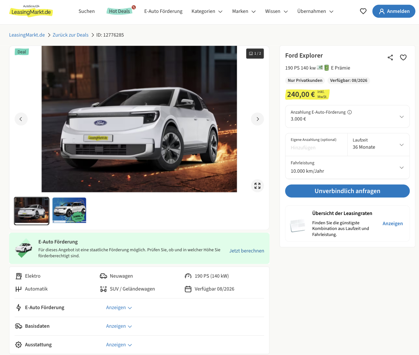 Der Einstieg in ein modernes Elektro-SUV muss nicht automatisch teuer sein. Ford Explorer Standard Range 58 kWh RWD bei LeasingMarkt für 240 Euro brutto im Monat zeigt genau das und bringt ein geräumiges E-SUV zu einer Rate auf die Straße, die in dieser Klasse auffällt. Grundlage der Kalkulation ist eine Umweltprämie von 3.000 Euro, die in die Rate eingerechnet wurde. Auf die Laufzeit verteilt ergibt sich eine realistische Vergleichsrate von 323,33 Euro brutto pro Monat. Das Fahrzeug ist als Bestellmodell geplant und ab August 2026 verfügbar.