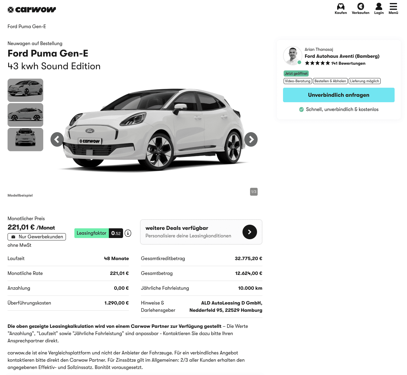 Das Angebot ist auf 48 Monate Laufzeit und 10.000 Kilometer pro Jahr ausgelegt, kann jedoch flexibel angepasst werden. Der Preisvorteil ist beachtlich: Während der Marktführer derzeit 317 Euro netto im Monat verlangt, steht der Puma Gen-E bei carwow für 221 Euro netto in der Liste, eine Ersparnis, die sich sehen lassen kann.