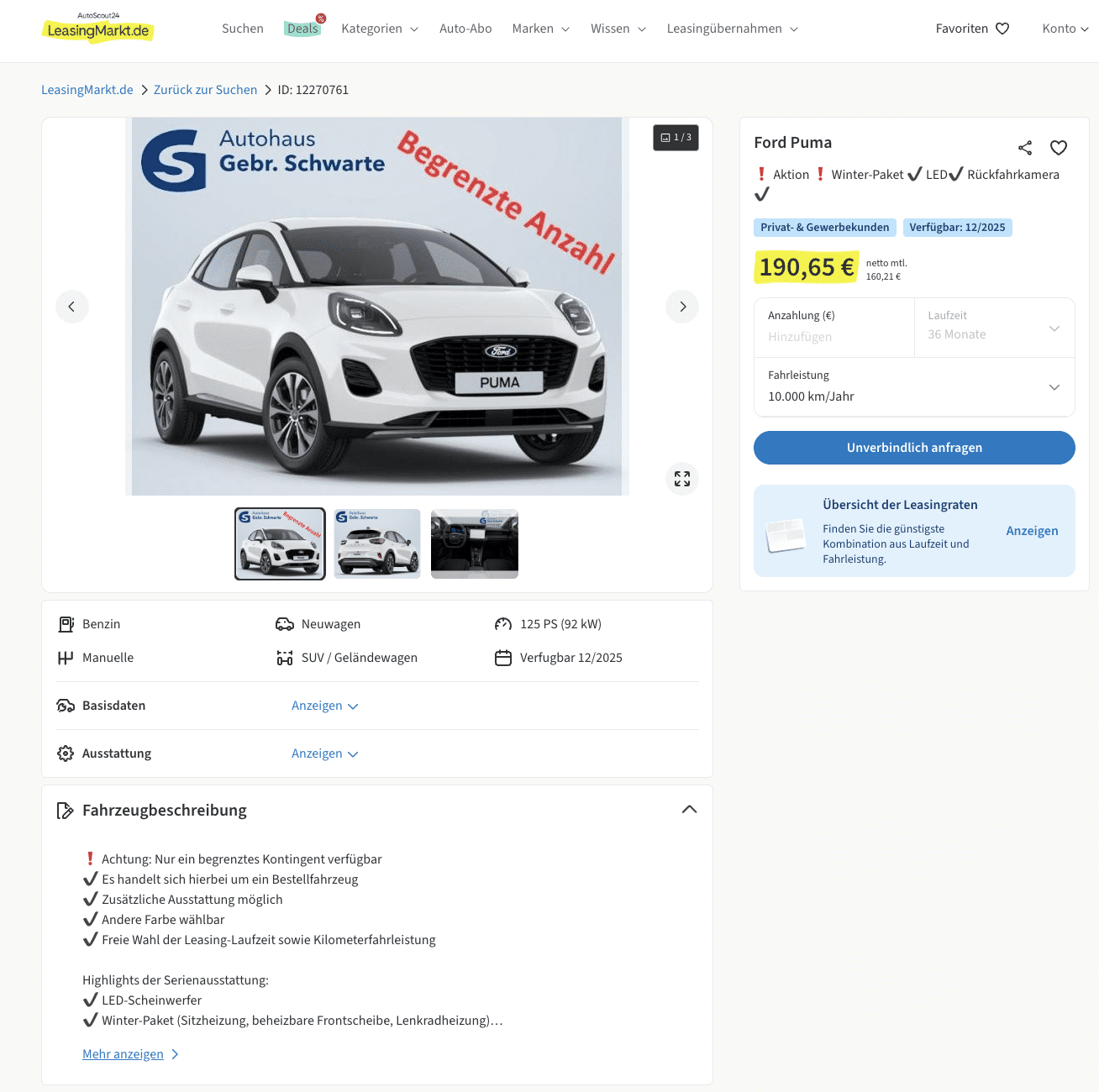 Das Leasing läuft über 36 Monate und 10.000 Kilometer pro Jahr – genug, um den Puma als täglichen Begleiter zu genießen. Mit 190,65 Euro brutto im Monat ist er ein echtes Schnäppchen, und weil ihr ihn frei konfigurieren könnt, passt er sich perfekt an euren Stil an.