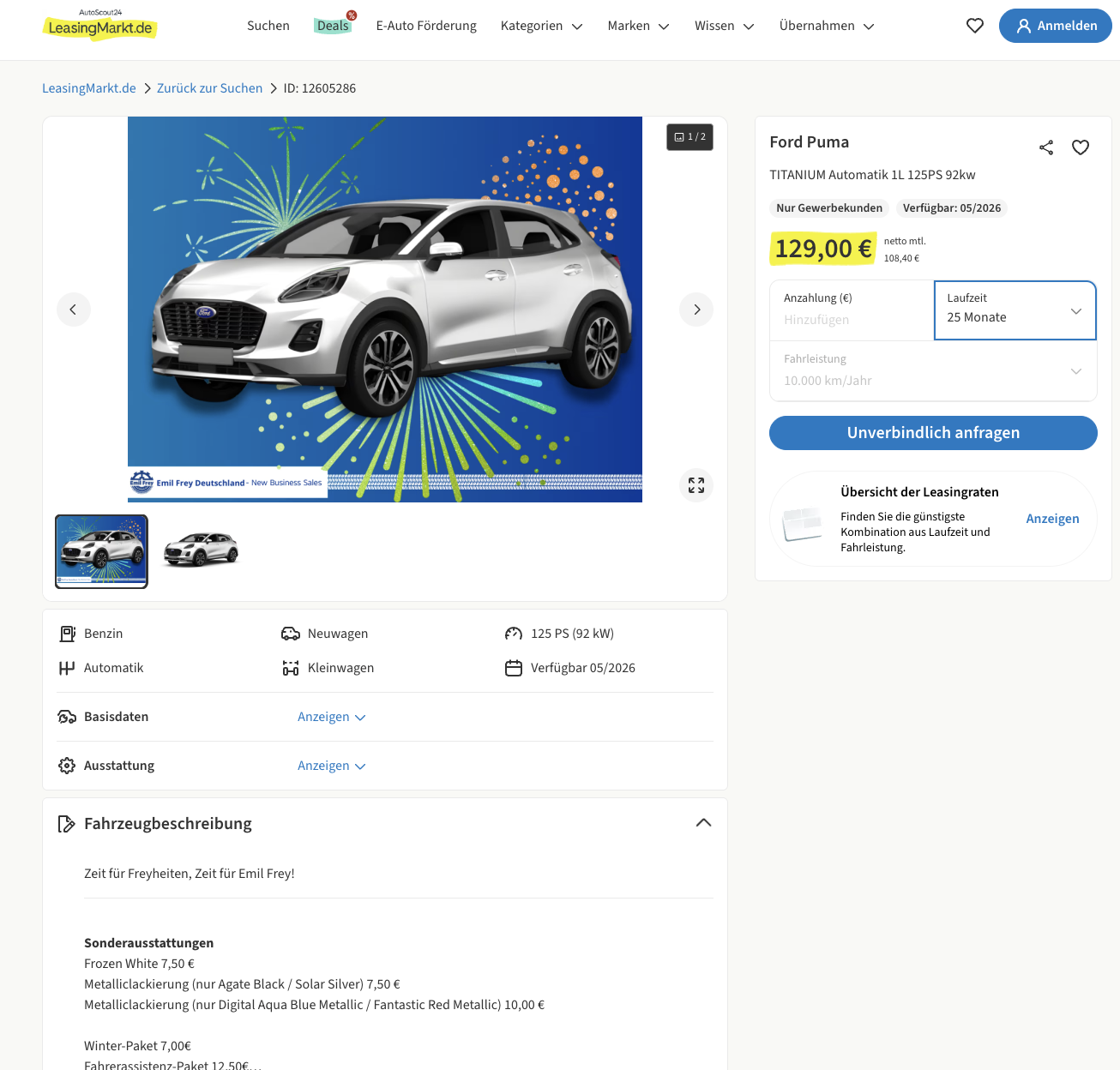 Das Angebot ist auf 25 Monate Laufzeit mit 10.000 Kilometern pro Jahr ausgelegt, Anpassungen sind üblicherweise möglich. Besonders ins Gewicht fällt der Marktvergleich. Während andere Anbieter für einen vergleichbaren Ford Puma teils rund 342 Euro netto pro Monat aufrufen, bleibt dieses Angebot bei 108,40 Euro netto.