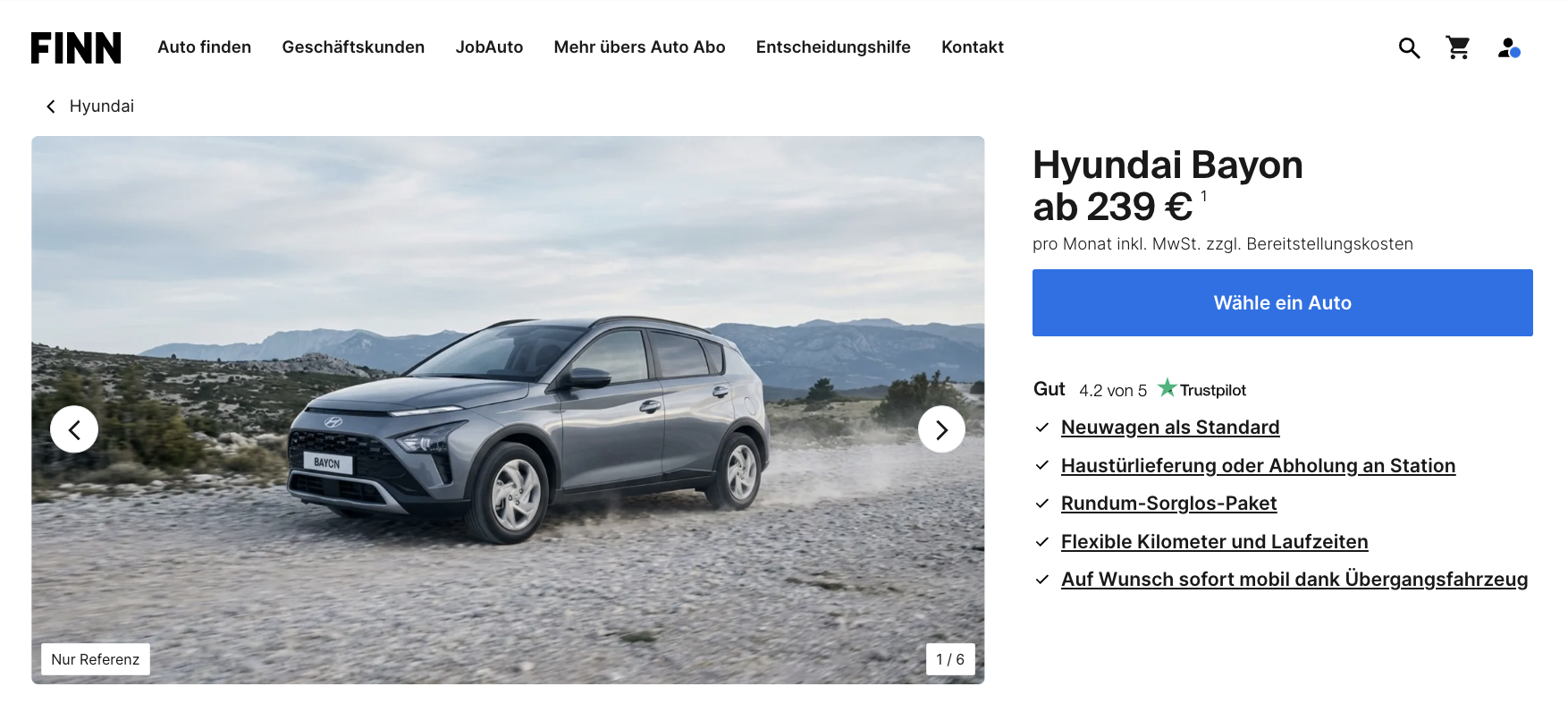 Kompakt, übersichtlich und ohne klassischen Leasingaufwand. Hyundai Bayon 1.0 T-GDI Select bei FINN für 239 Euro brutto im Monat steht für ein Auto-Abo, das vor allem durch klare Kosten und flexible Nutzung überzeugt. Die Verfügbarkeit ist für den 23.04.2026 vorgesehen, verschiedene Farben sind wählbar.